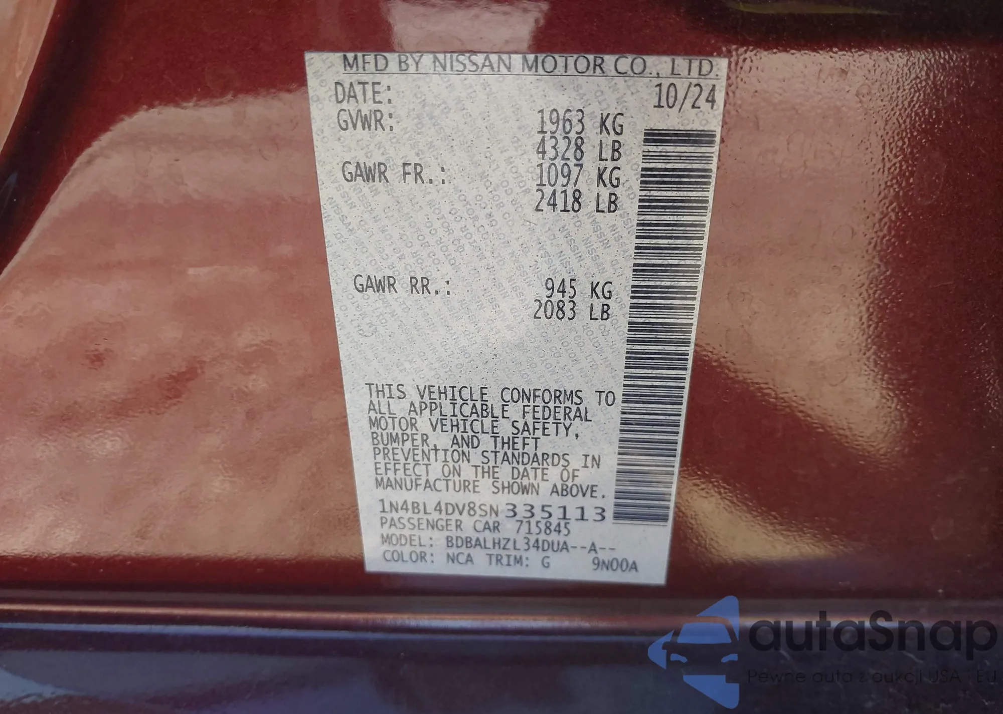 LOT: 43919935 VIN: 1N4BL4DV8SN335113