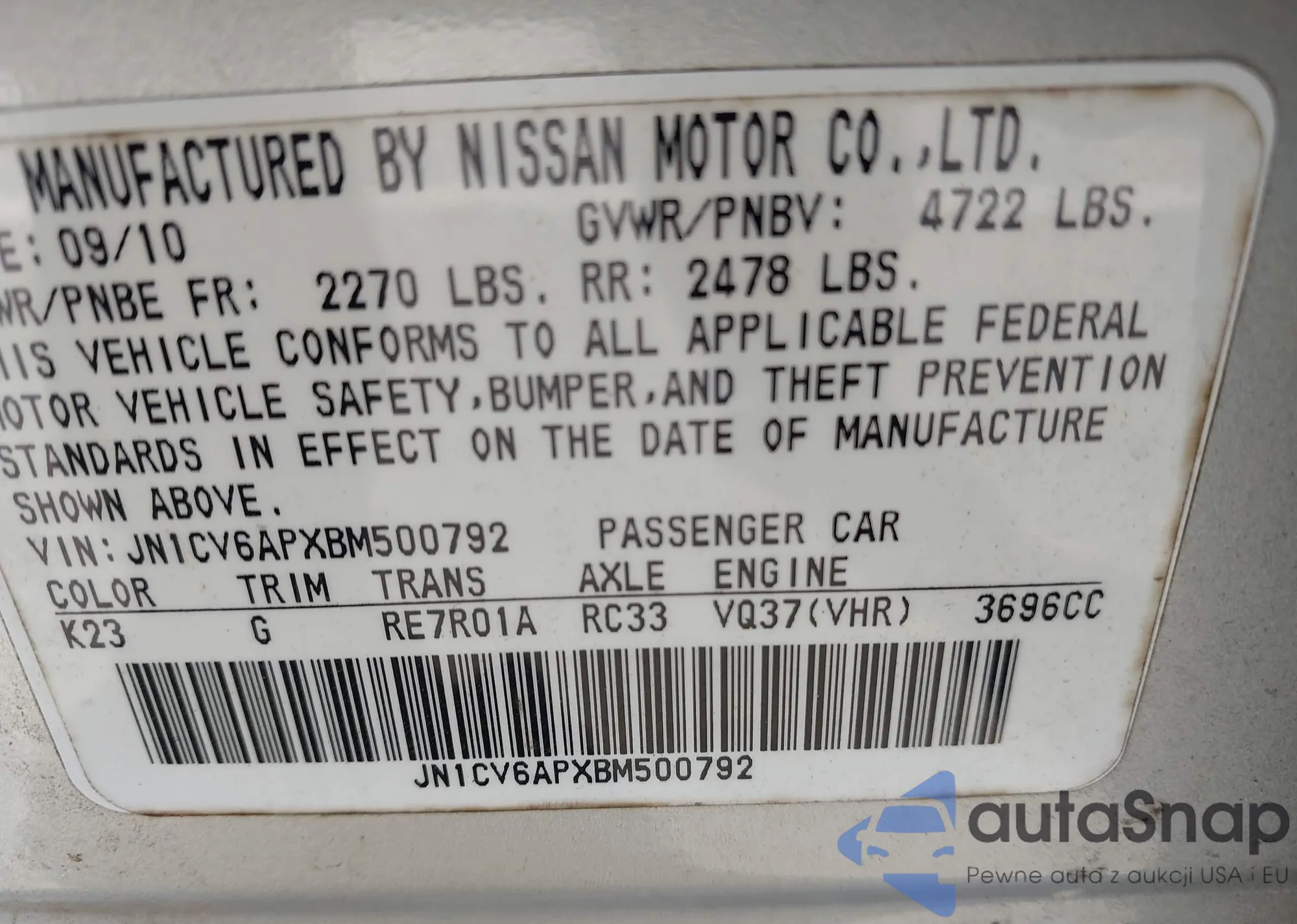 • VIN JN1CV6APXBM500792