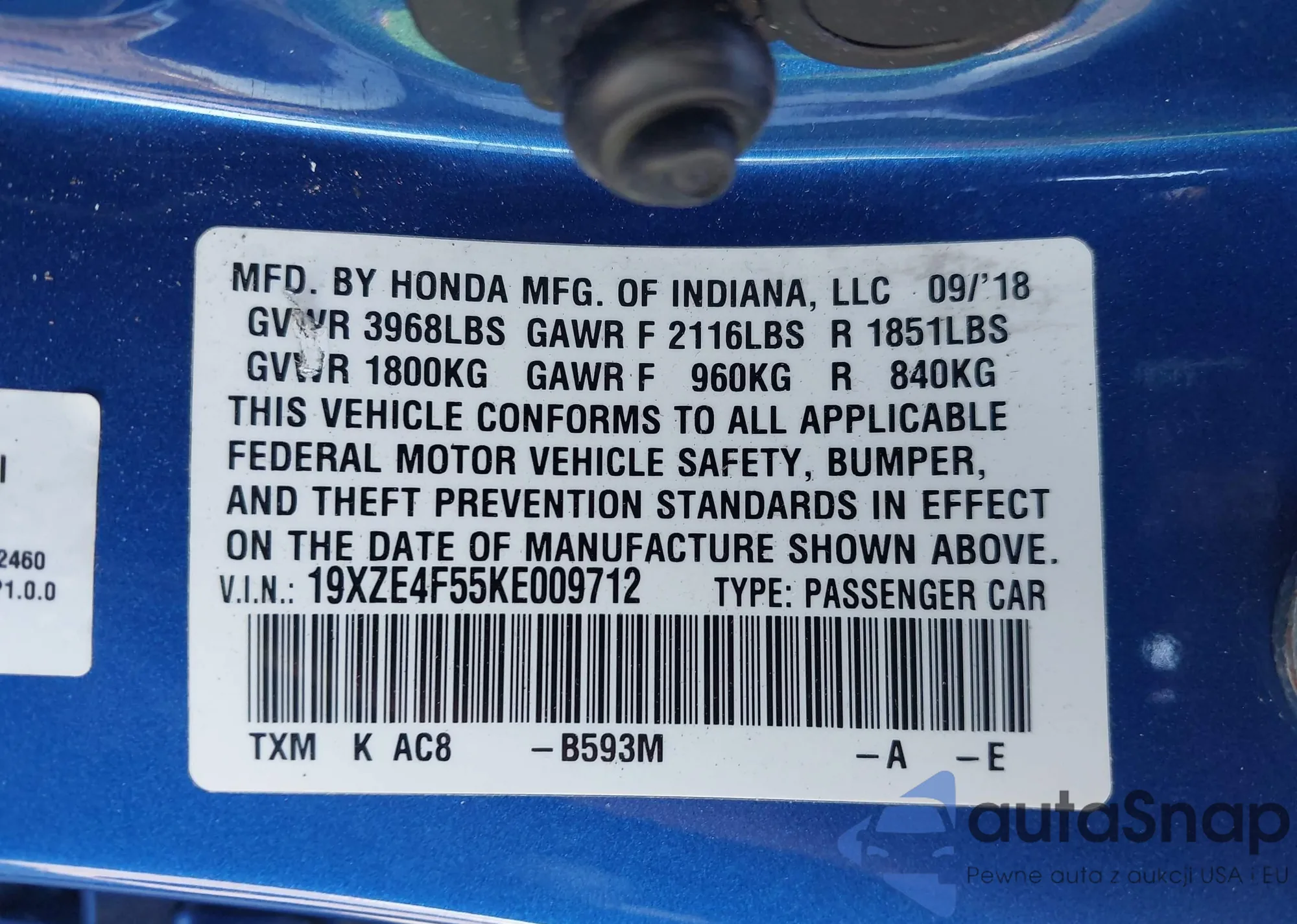 • VIN 19XFL4H84SE013900
