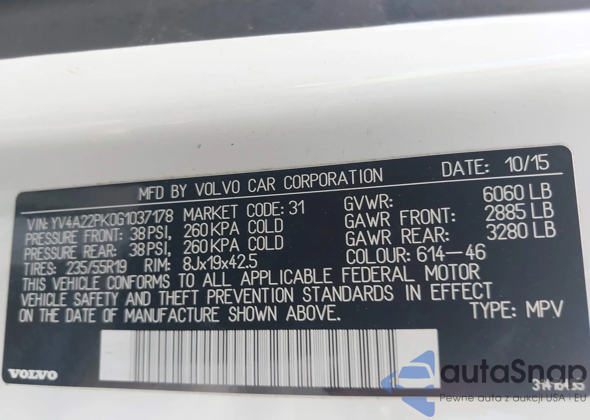 LOT: 43400995 VIN: YV4A22PK0G1037178