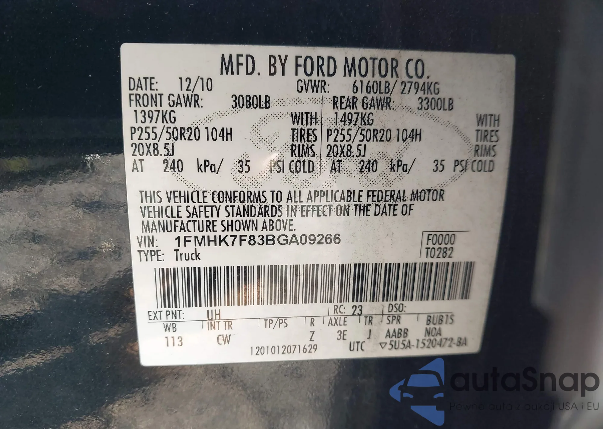 LOT: 43770746 VIN: 1FMHK7F83BGA09266
