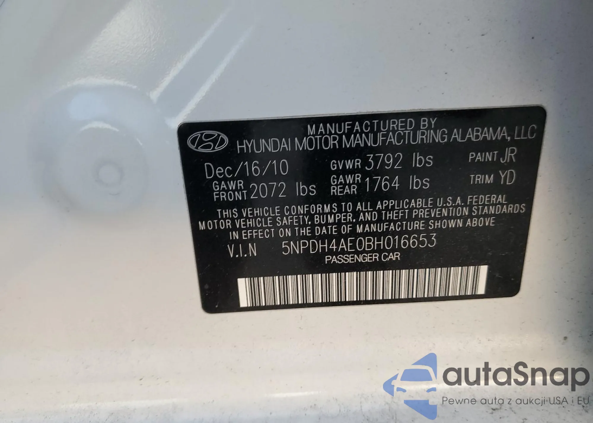 LOT: 92502835 VIN: 5NPDH4AE0BH016653