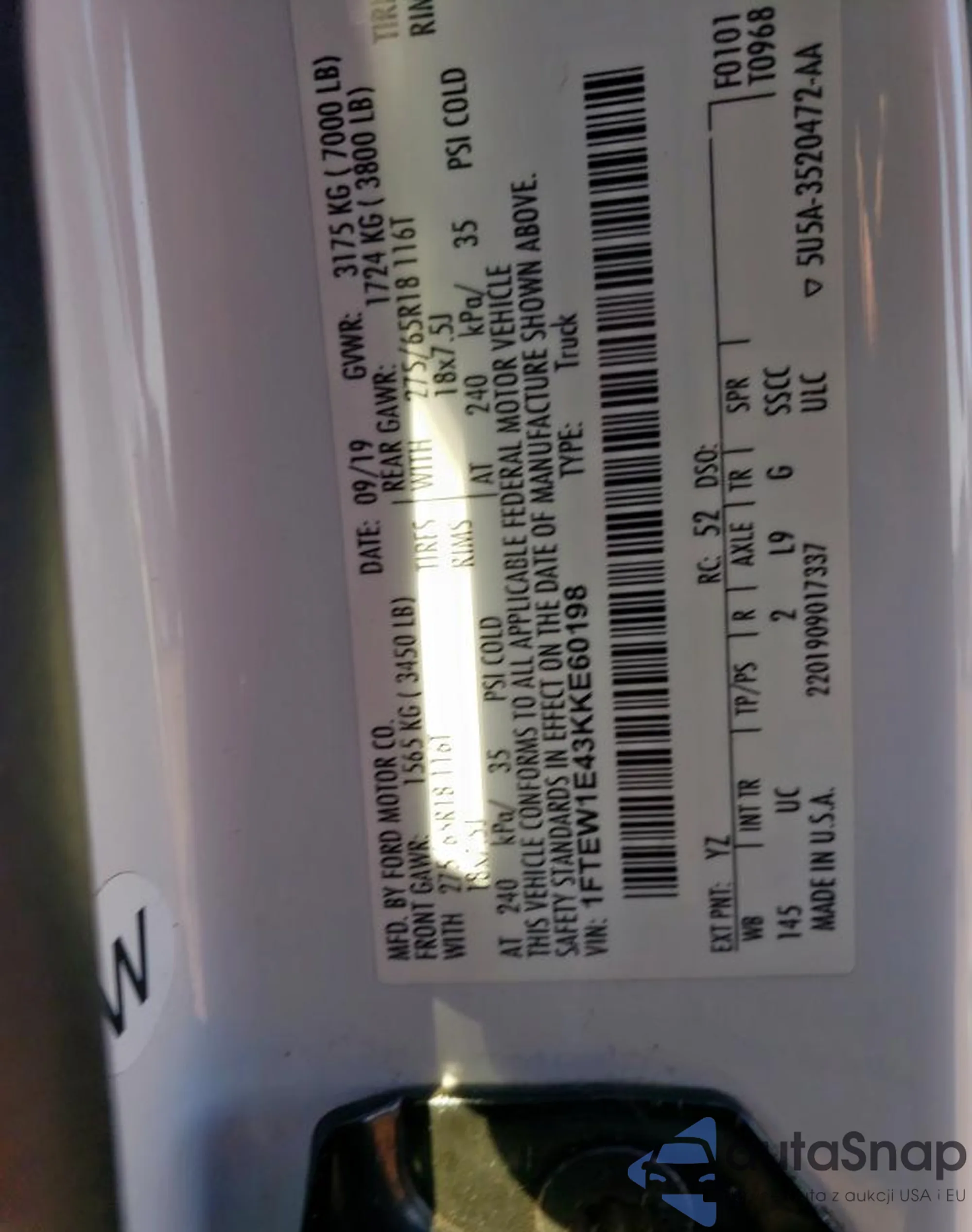 LOT: 80457295 VIN: 1FTEW1E43KKE60198