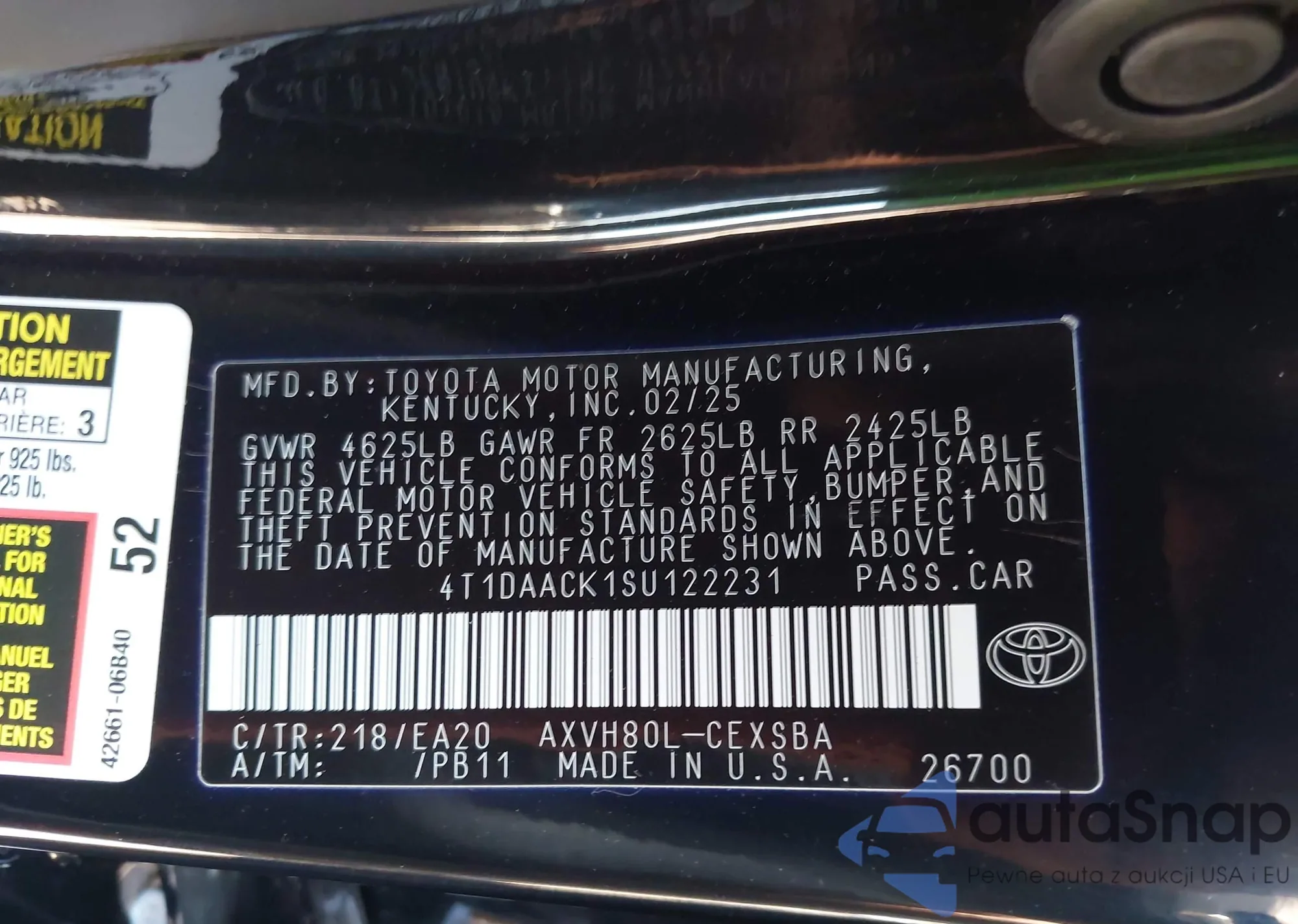 LOT: 43498046 VIN: 4T1DAACK1SU122231
