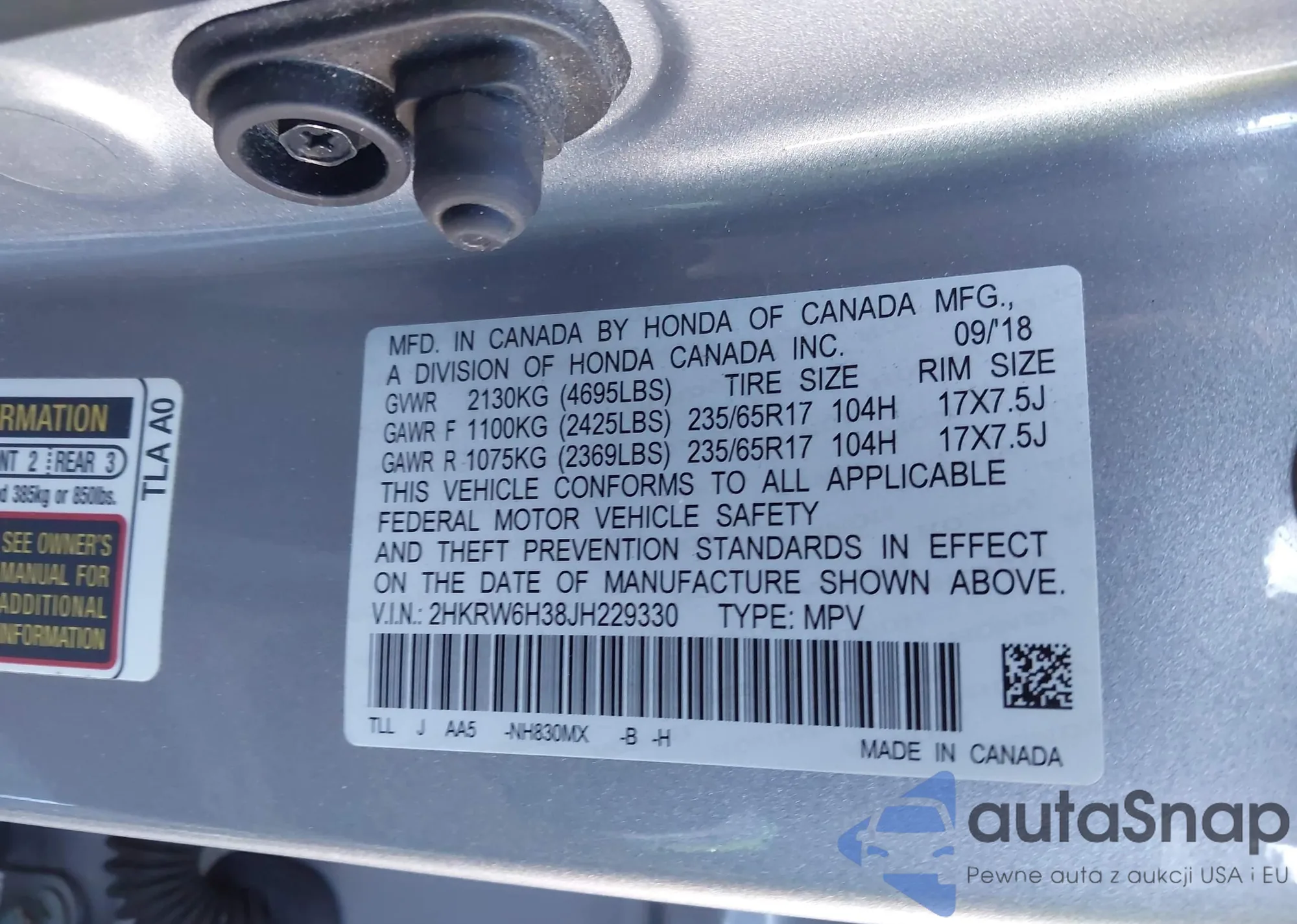 • VIN 2HKRW6H38JH229330
