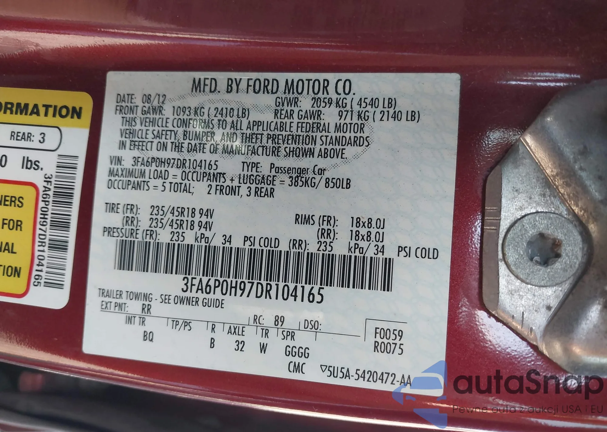 LOT: 43310266 VIN: 3FA6P0H97DR104165