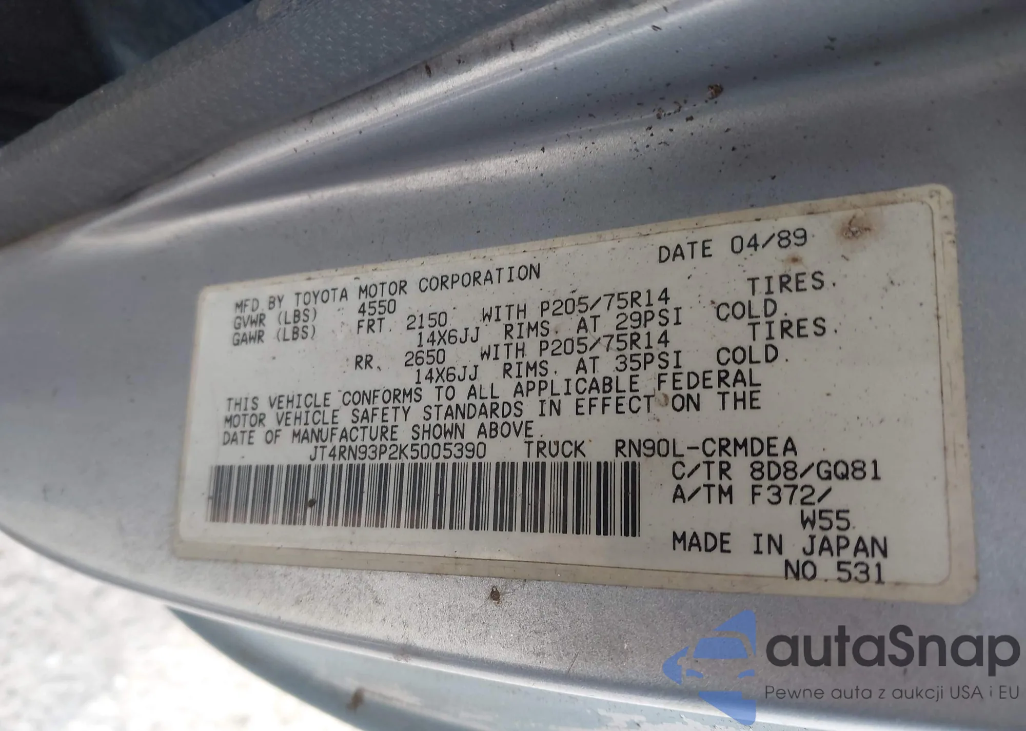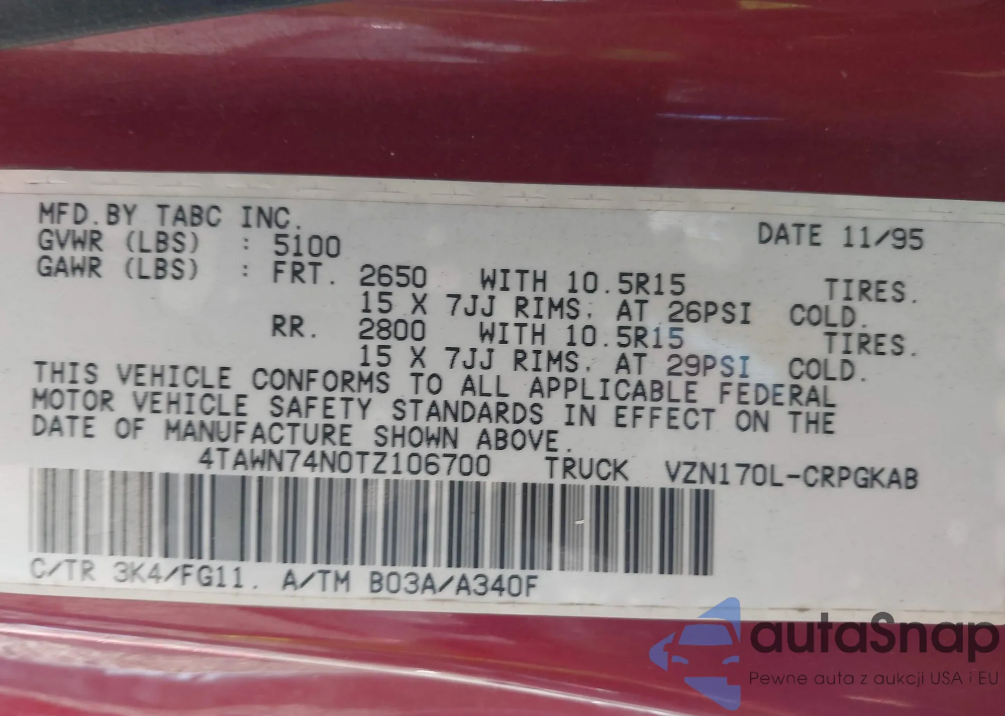 LOT: 43438089 VIN: 4TAWN74N0TZ106700