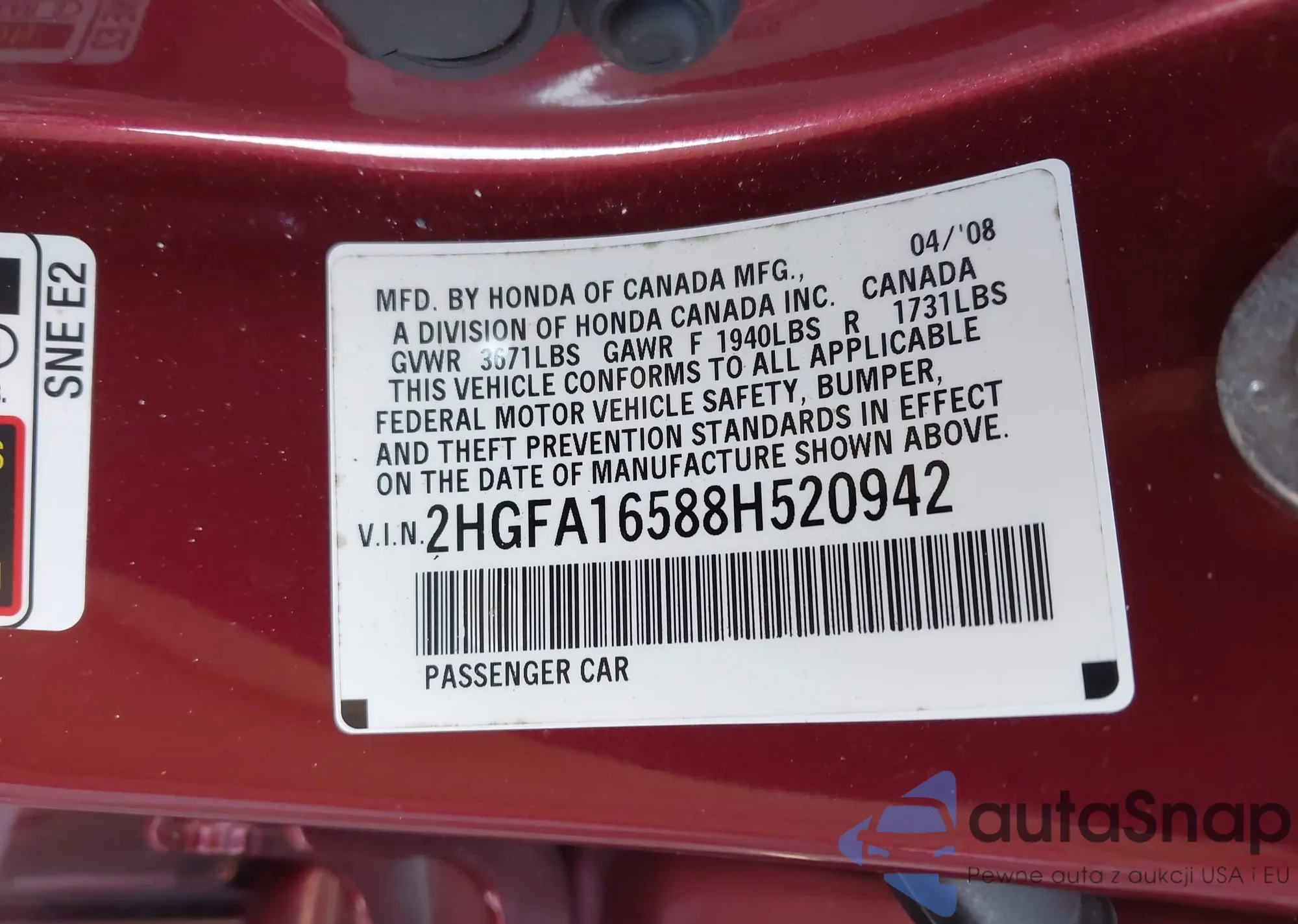 LOT: 43636599 VIN: 2HGFA16588H520942