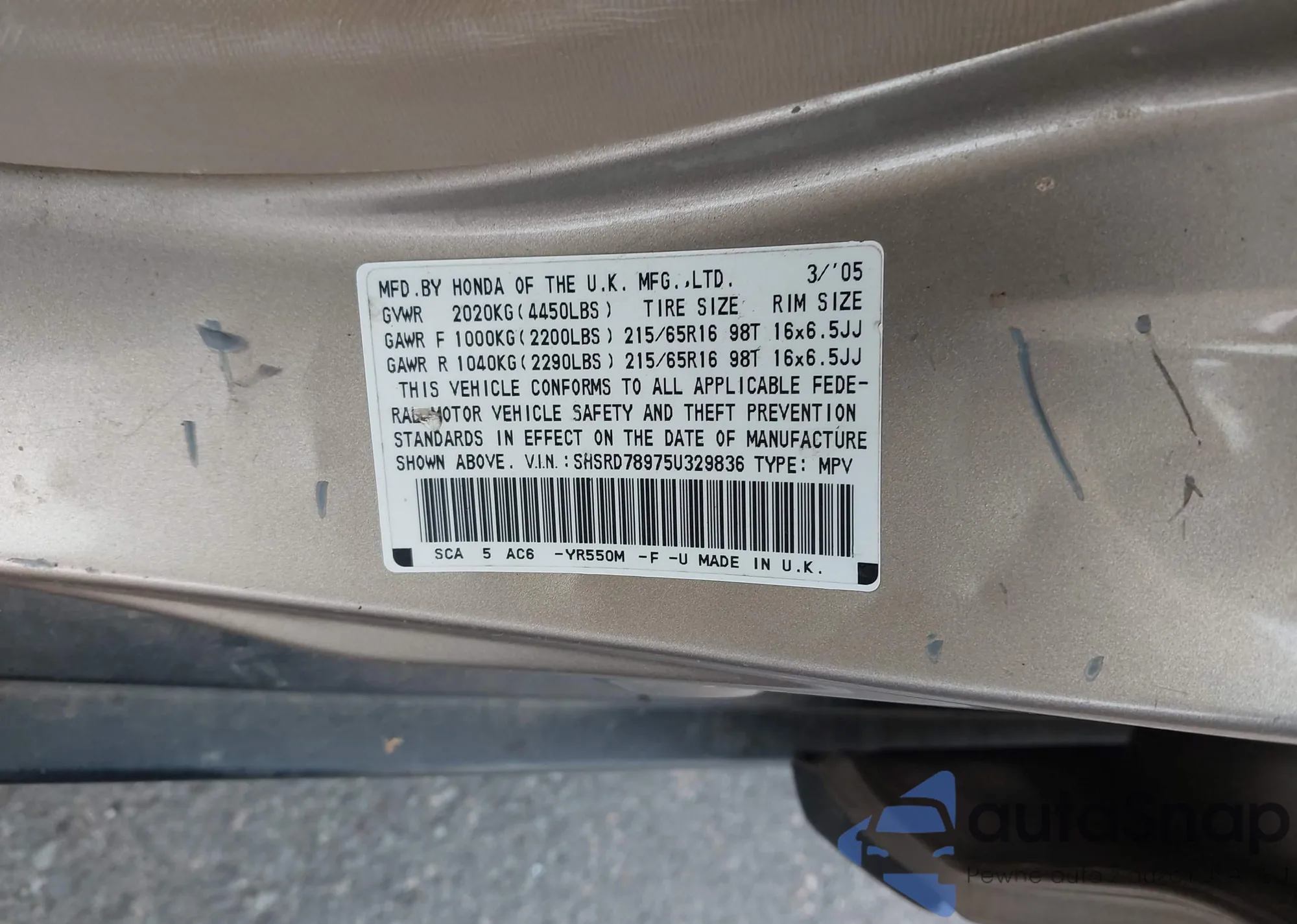 LOT: 43639273 VIN: SHSRD78975U329836