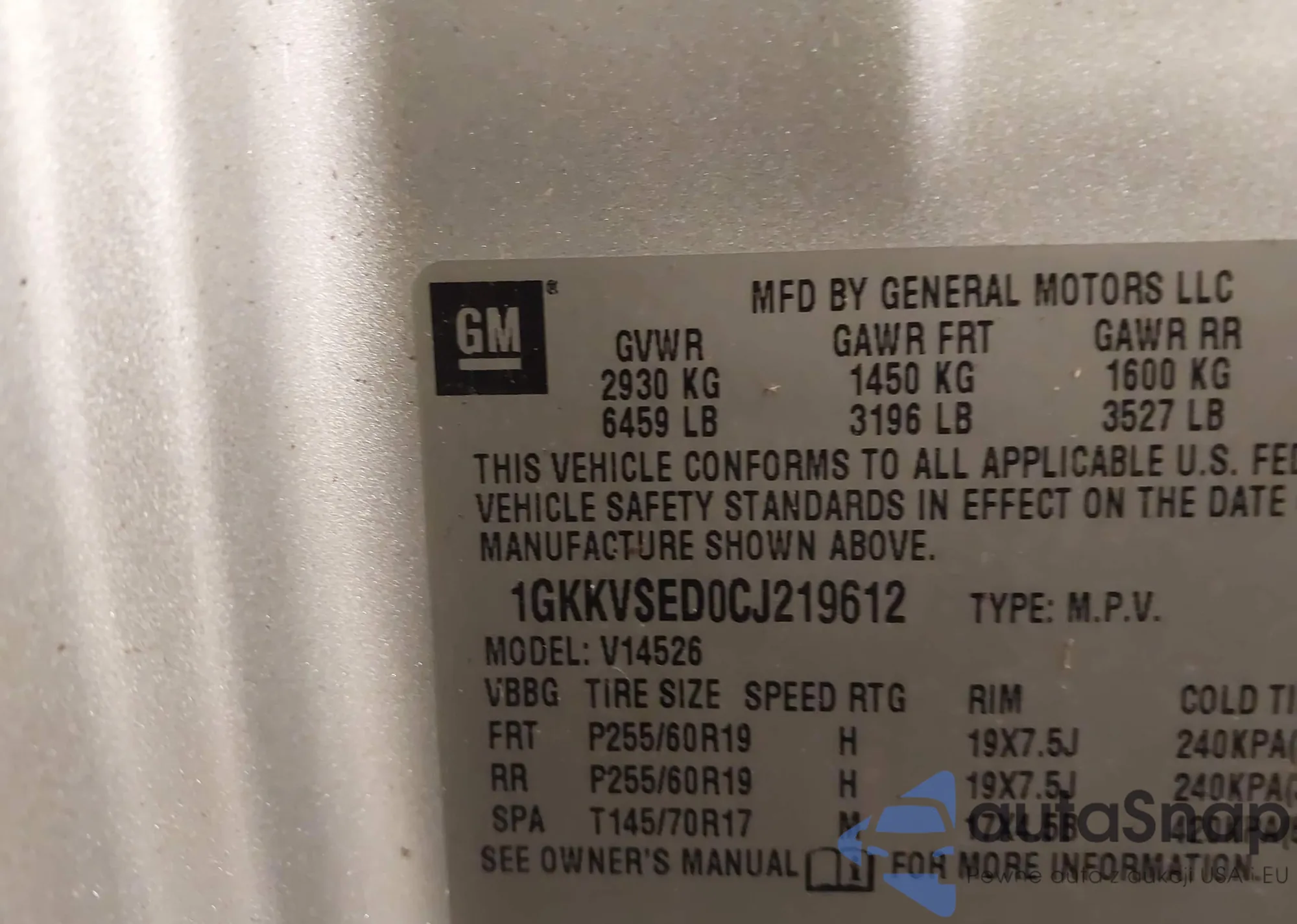 LOT: 43643266 VIN: 1GKKVSED0CJ219612