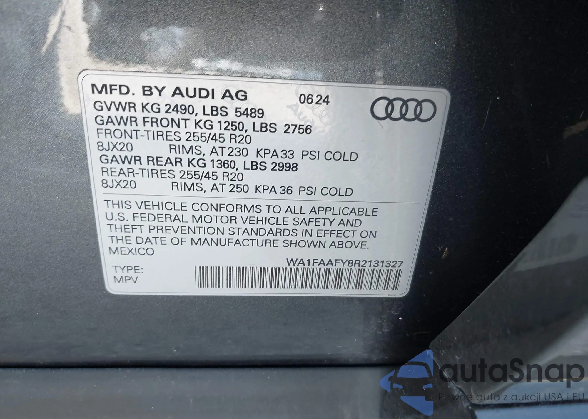 LOT: 43923845 VIN: WA1FAAFY8R2131327