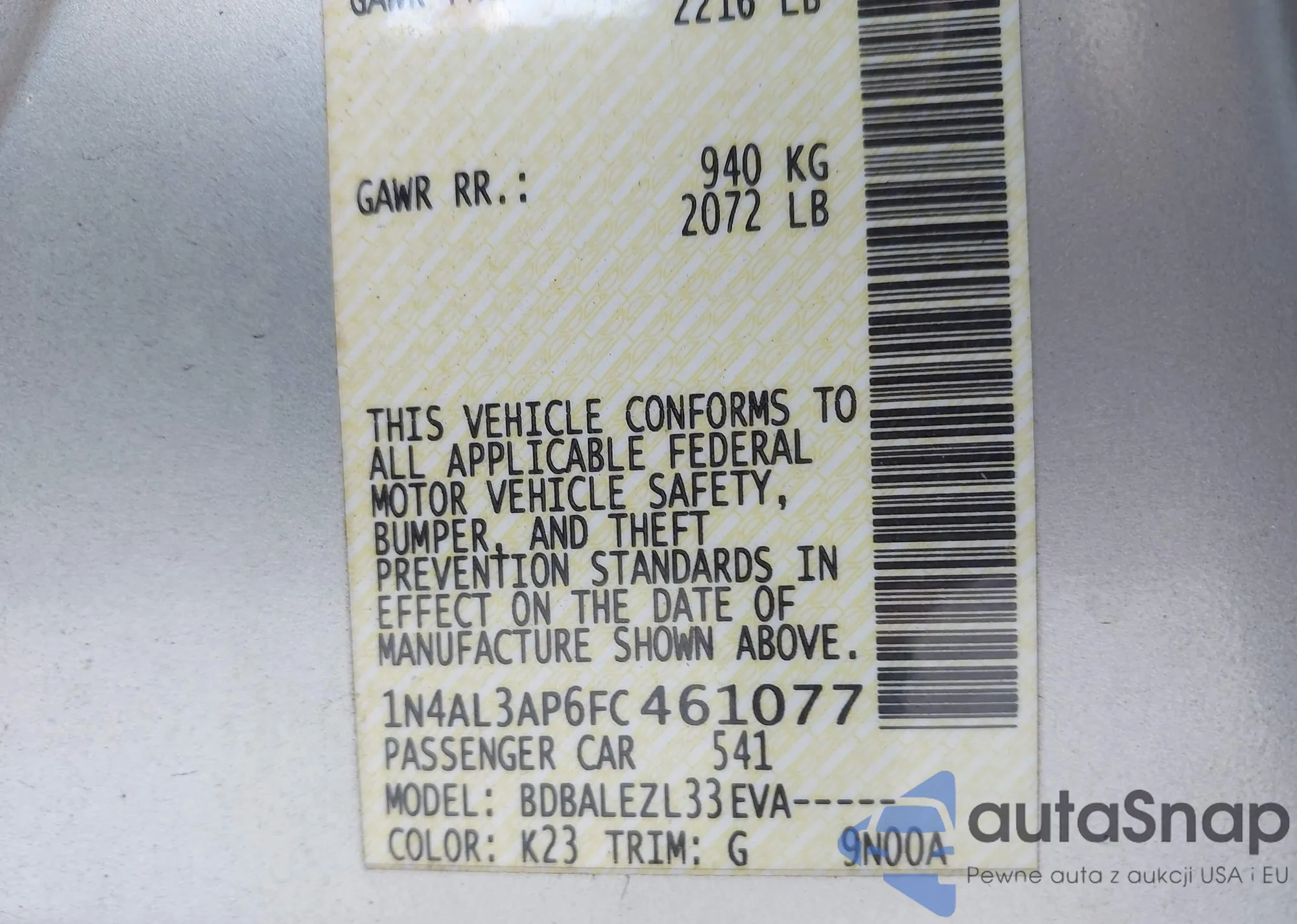 • VIN 1N4AL3AP6FC461077