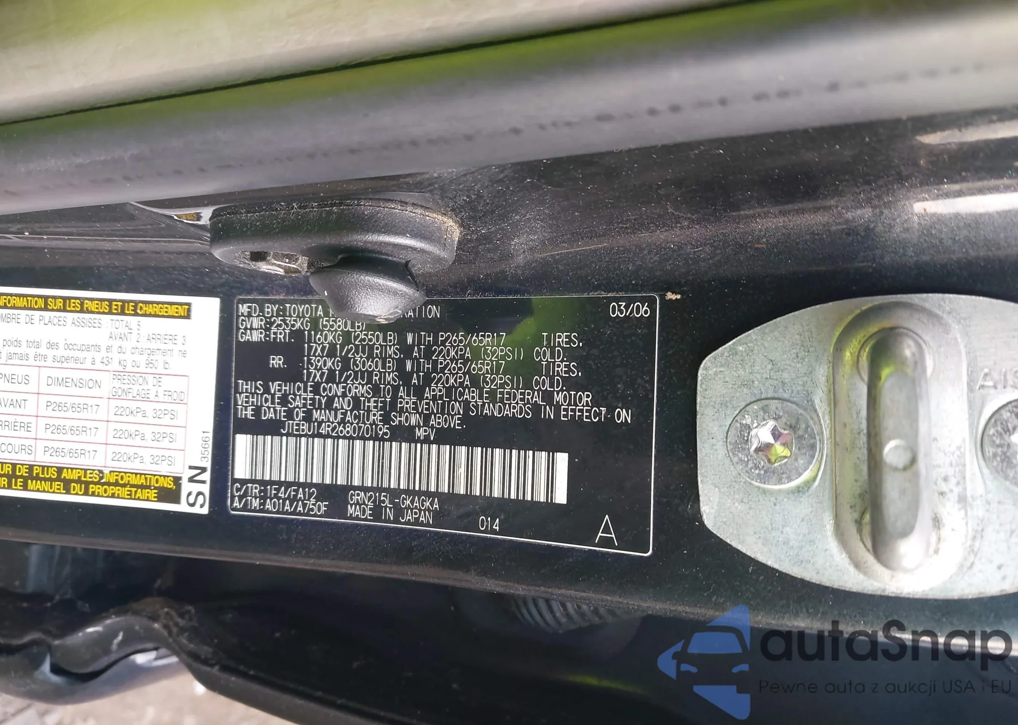LOT: 43767195 VIN: JTEBU14R268070195