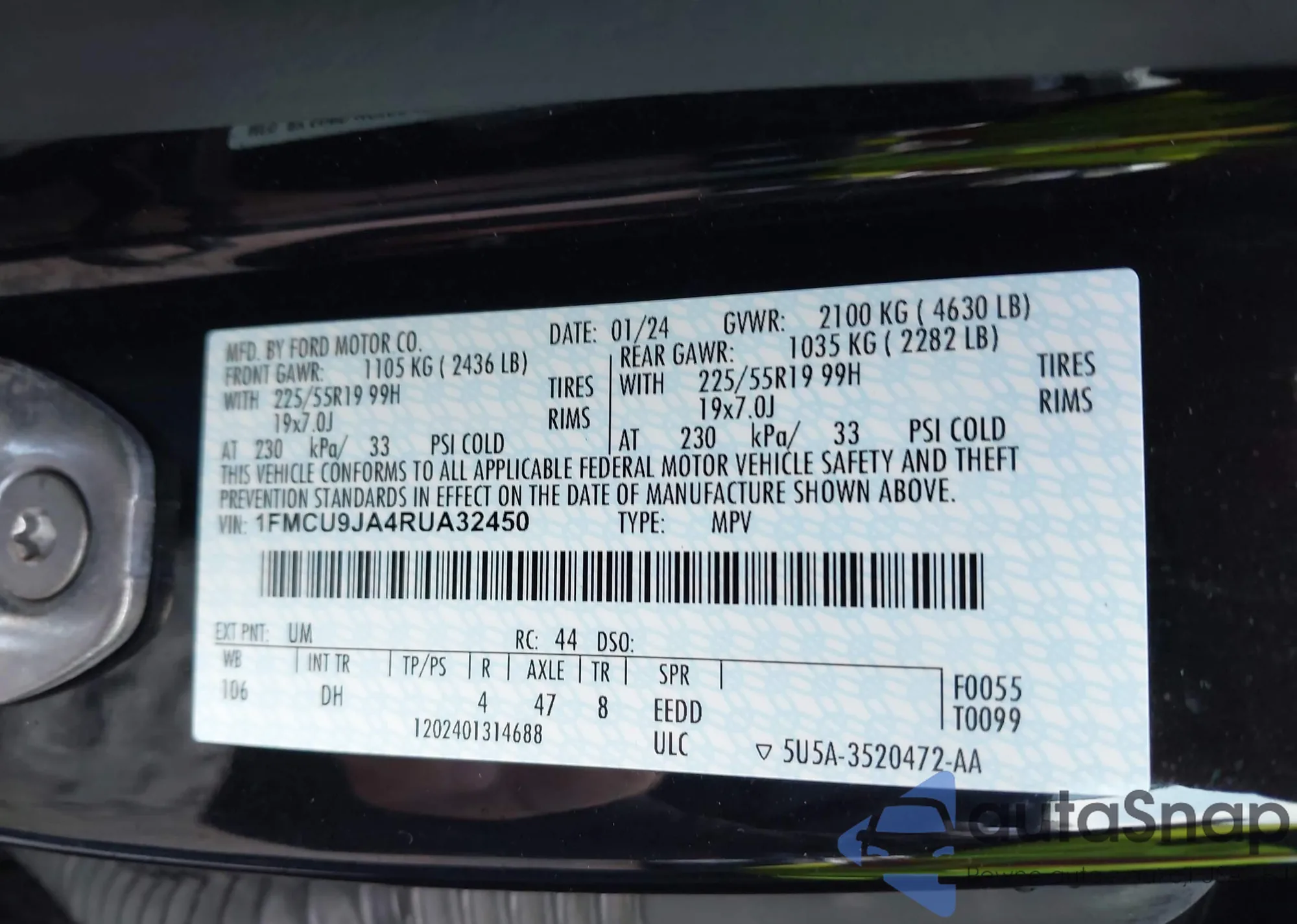 LOT: 43398572 VIN: 1FMSK7DH3NGB17240