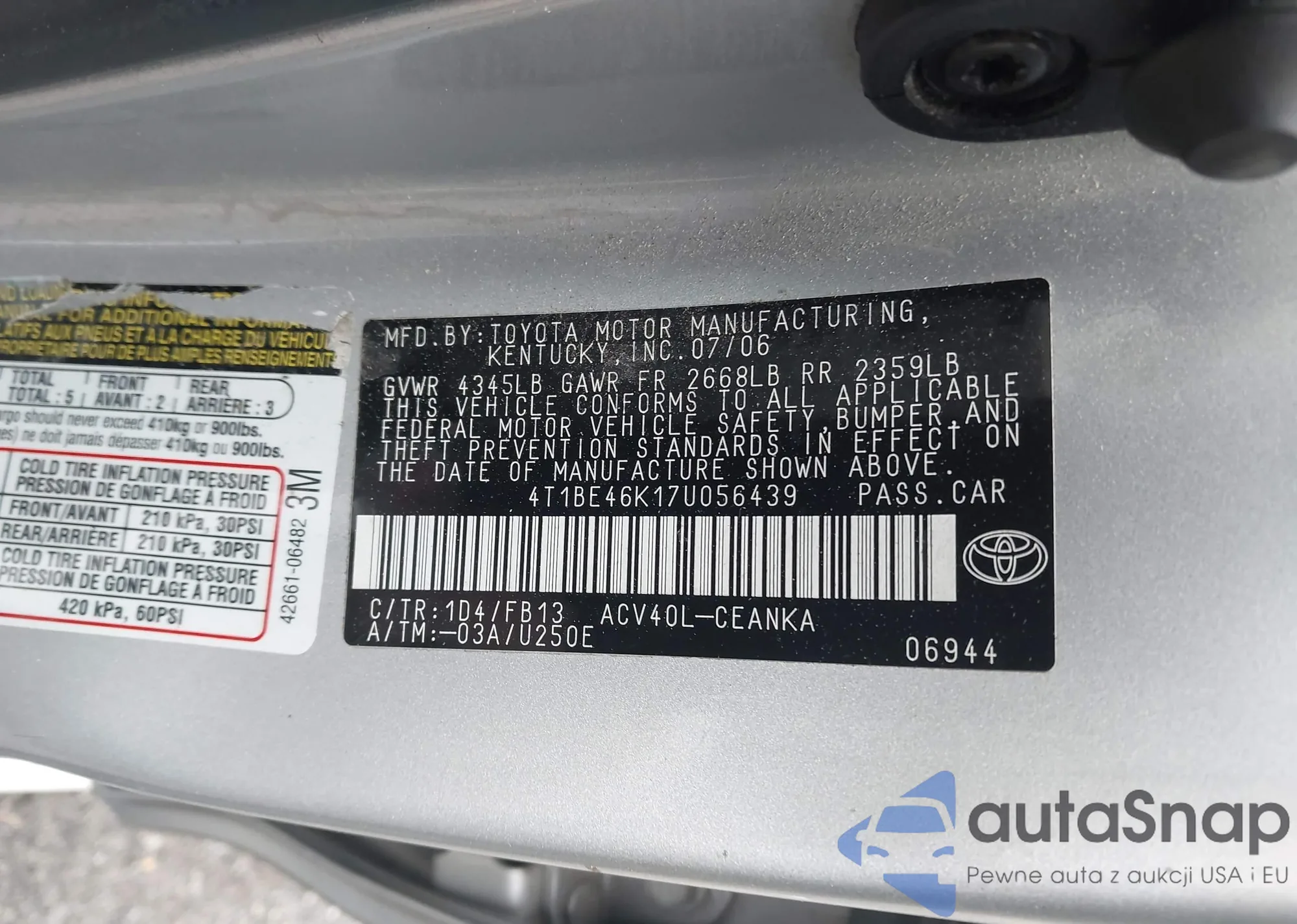 LOT: 43589016 VIN: 4T1BE46K17U056439