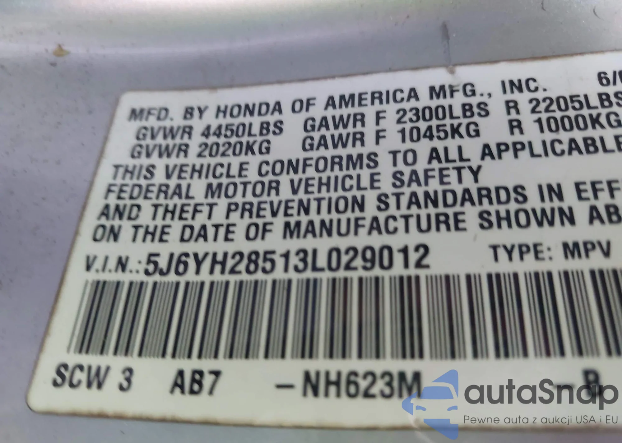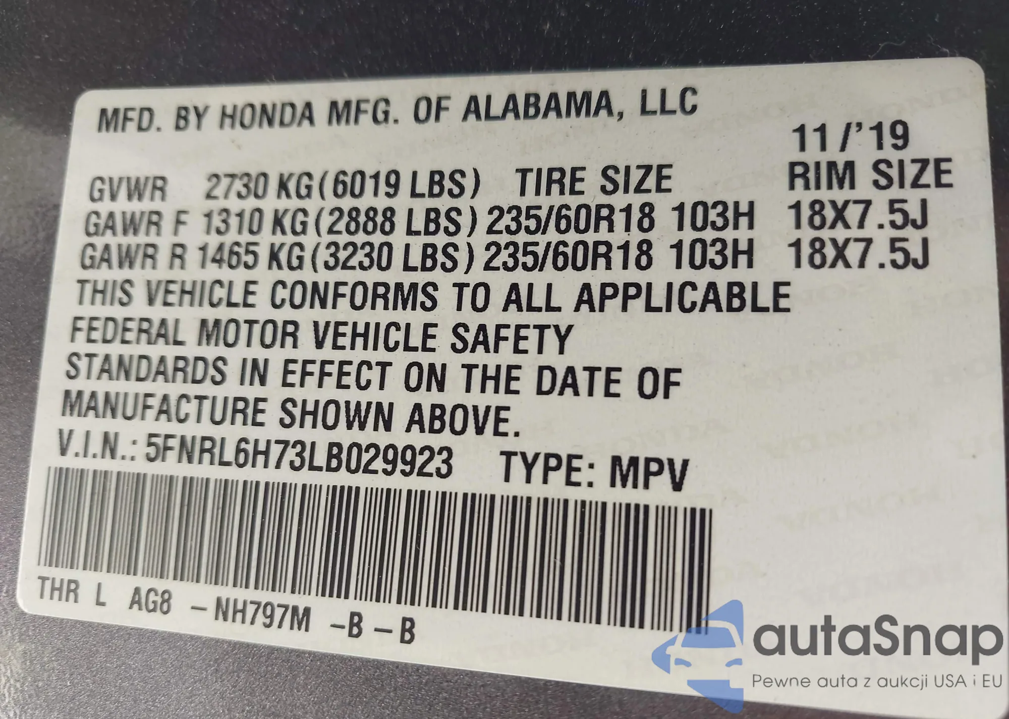 • VIN 5FNRL6H73LB029923