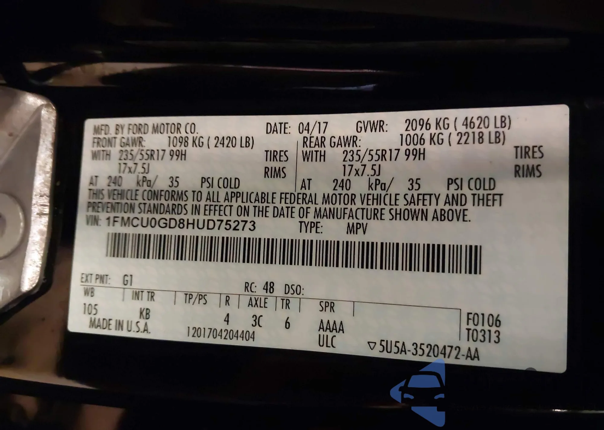 • VIN 1FMCU0GD8HUD75273