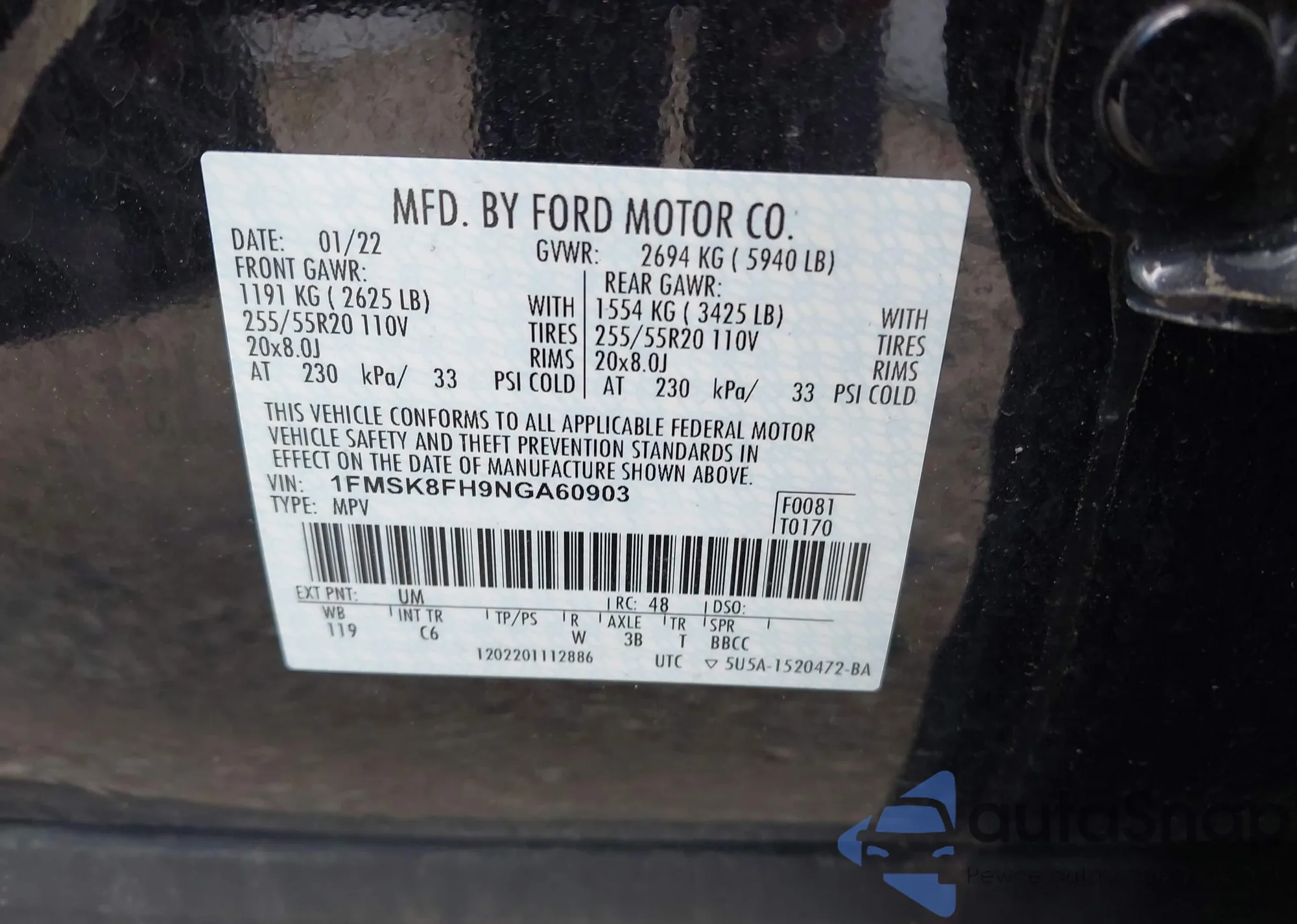LOT: 39438037 VIN: 1FMSK8FH9NGA60903