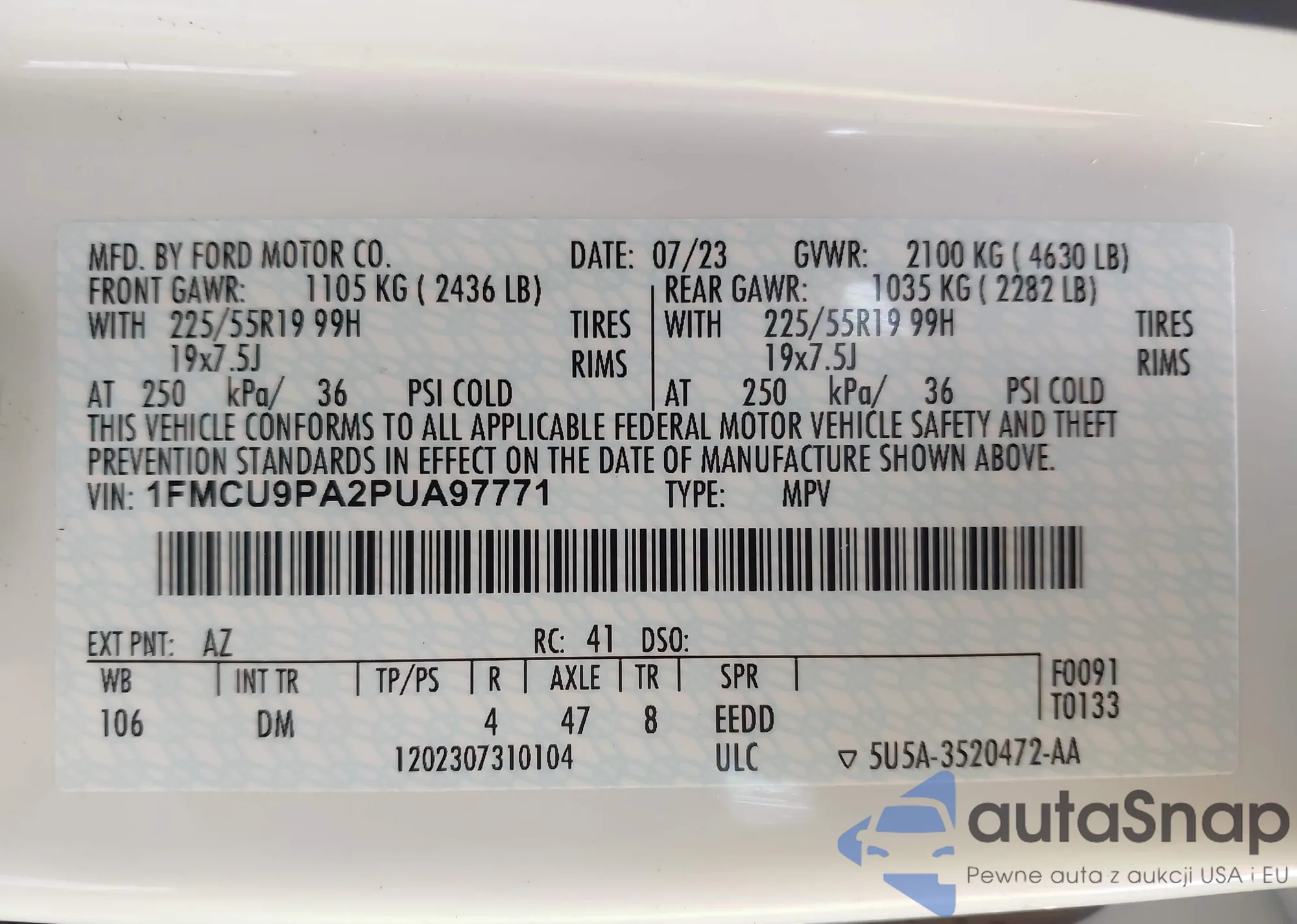 LOT: 43456821 VIN: 1FMCU9PA2PUA97771