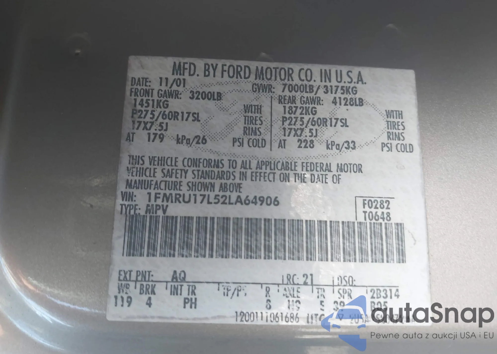LOT: 43686630 VIN: 1FMRU17L52LA64906