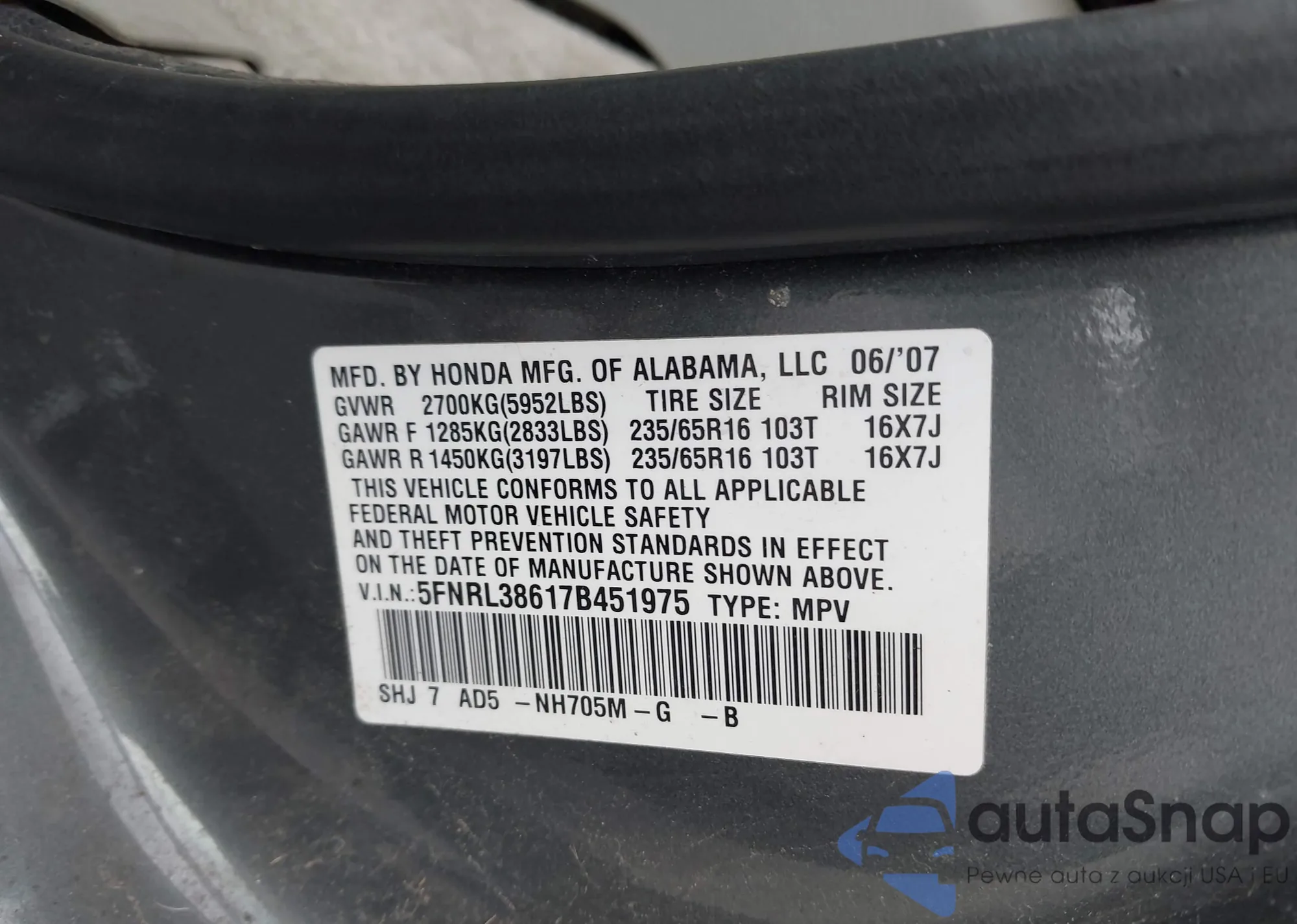 • VIN 5FNRL38617B451975