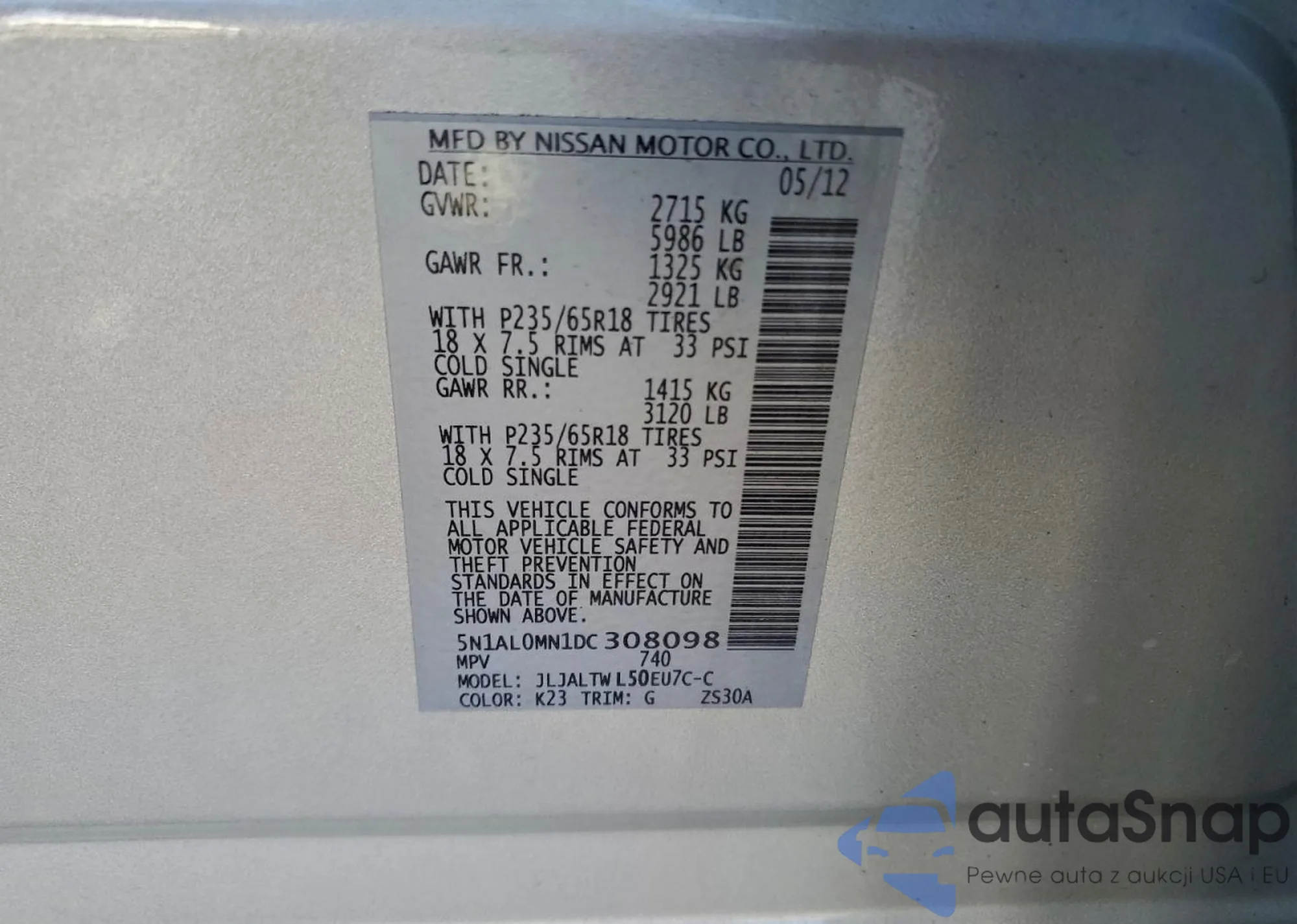 LOT: 93506965 VIN: 5N1AL0MN1DC308098