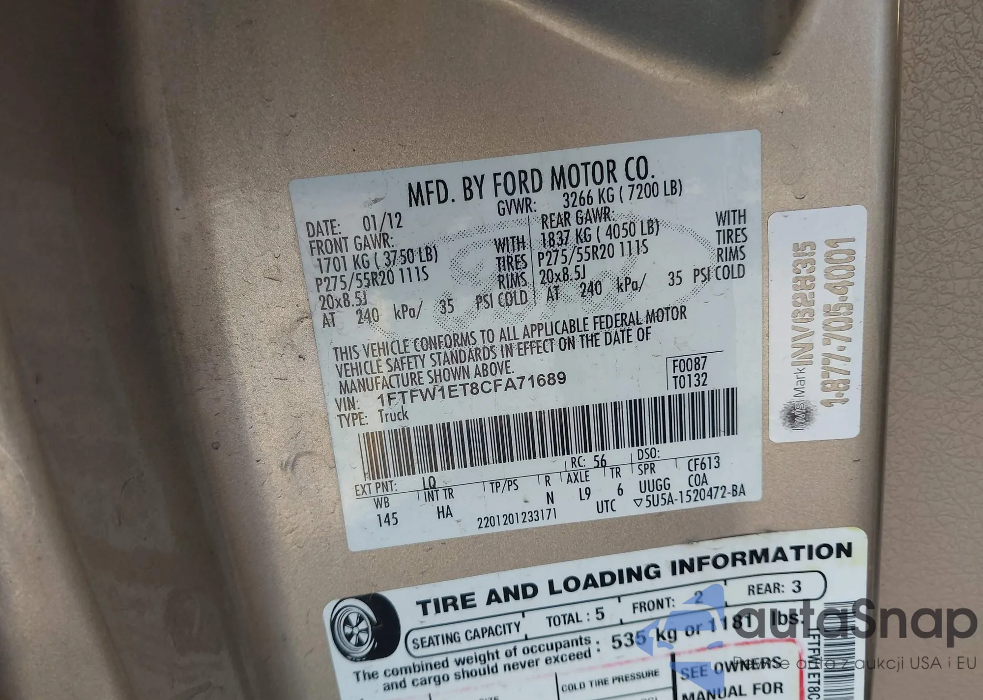 LOT: 43457544 VIN: WAULFAFR2CA016025