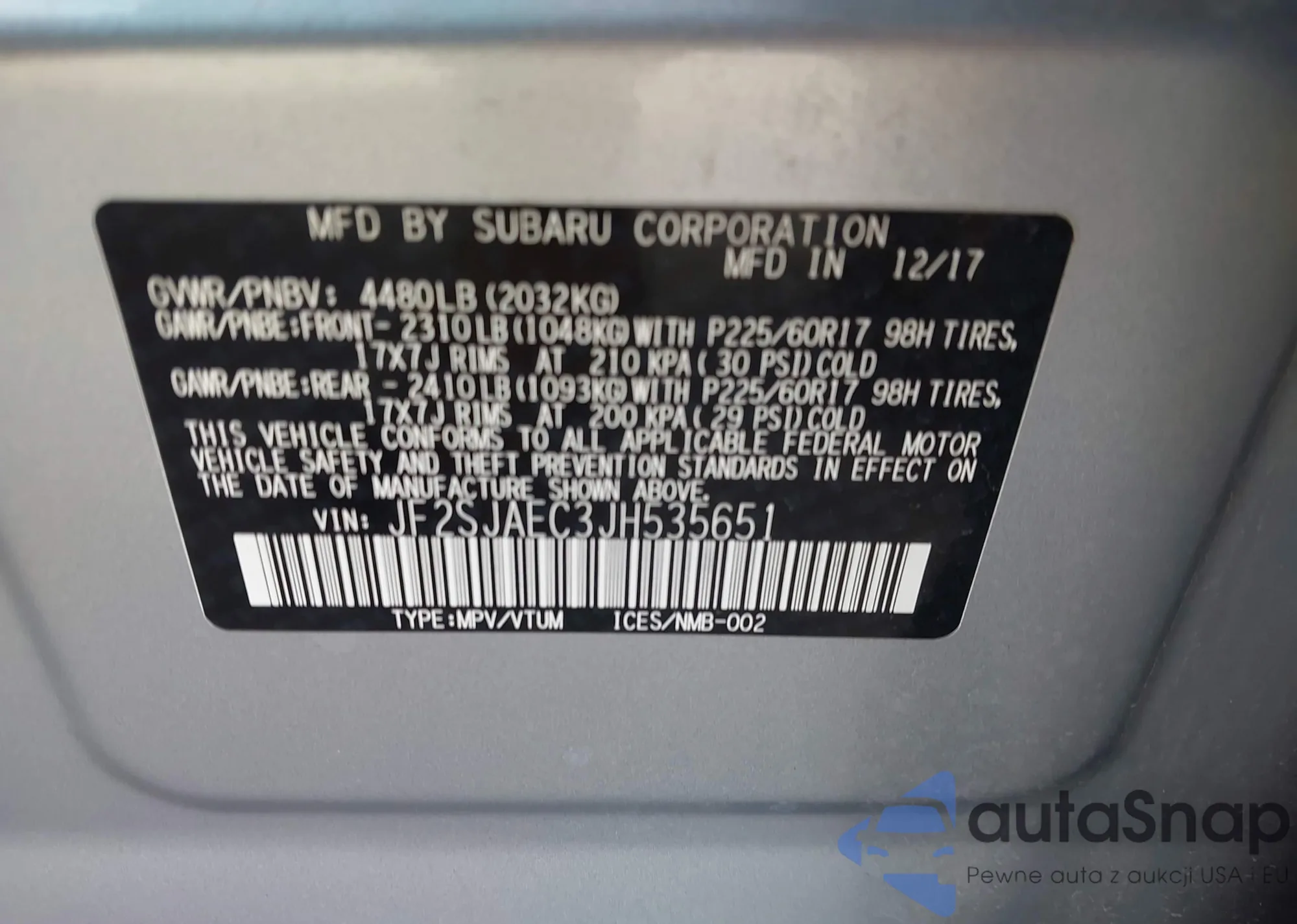 LOT: 43492803 VIN: JF2SJAEC3JH535651