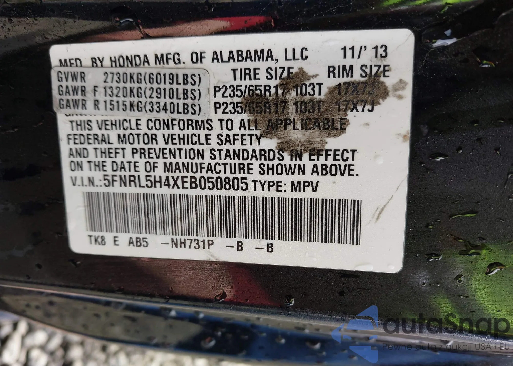 • VIN 5FNRL5H4XEB050805