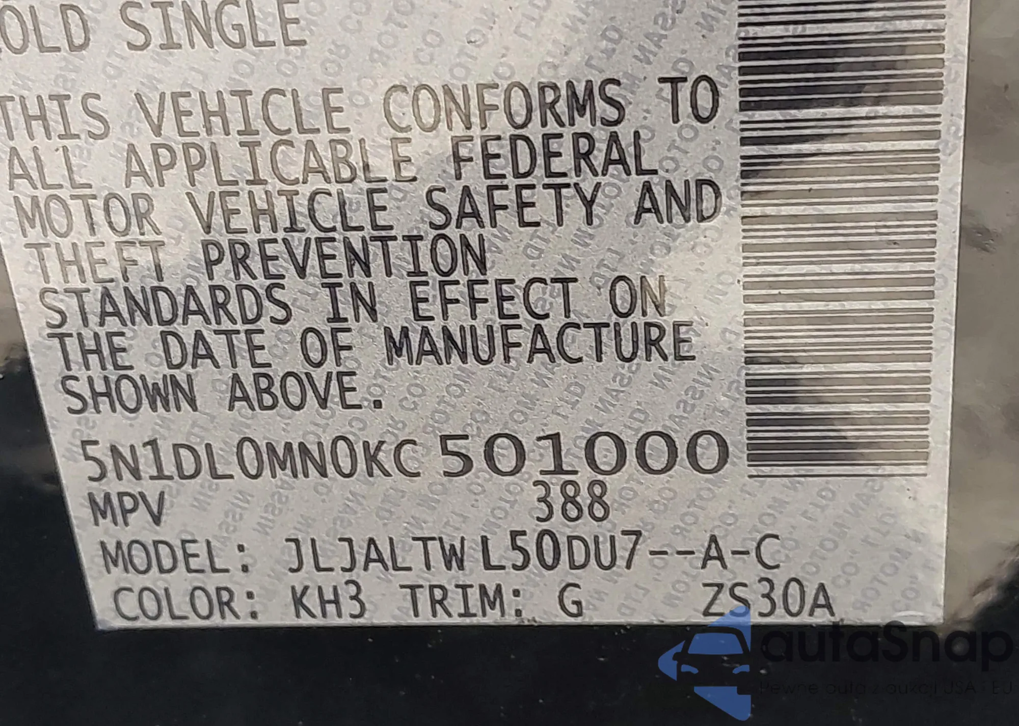 • VIN 5N1DL0MN0KC501000