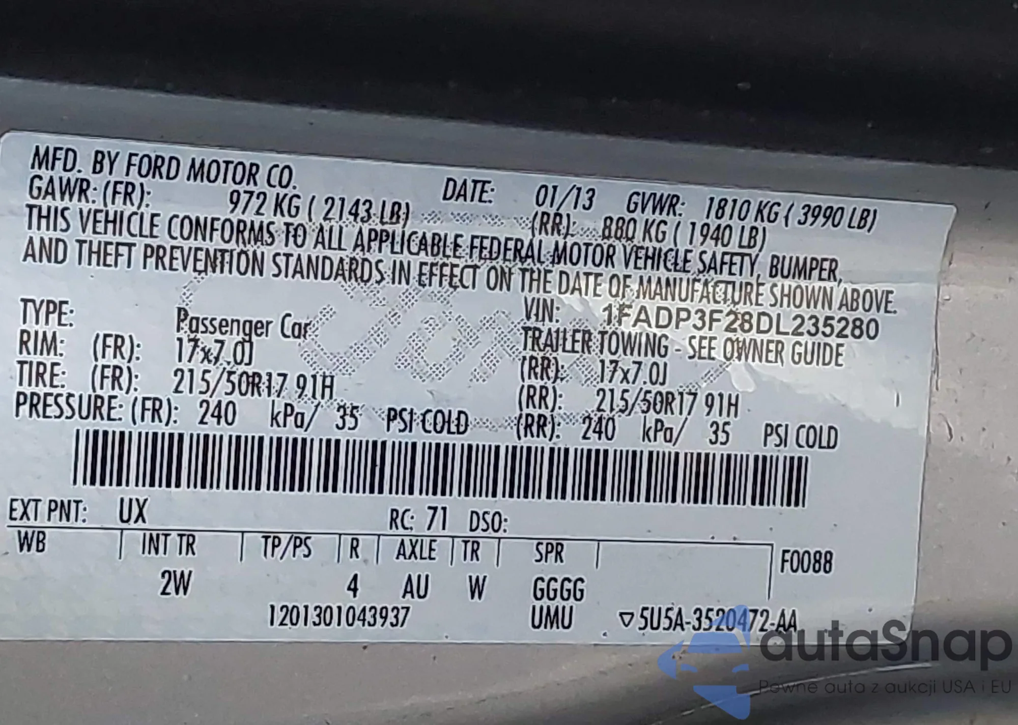 LOT: 43546076 VIN: 1FADP3F28DL235280