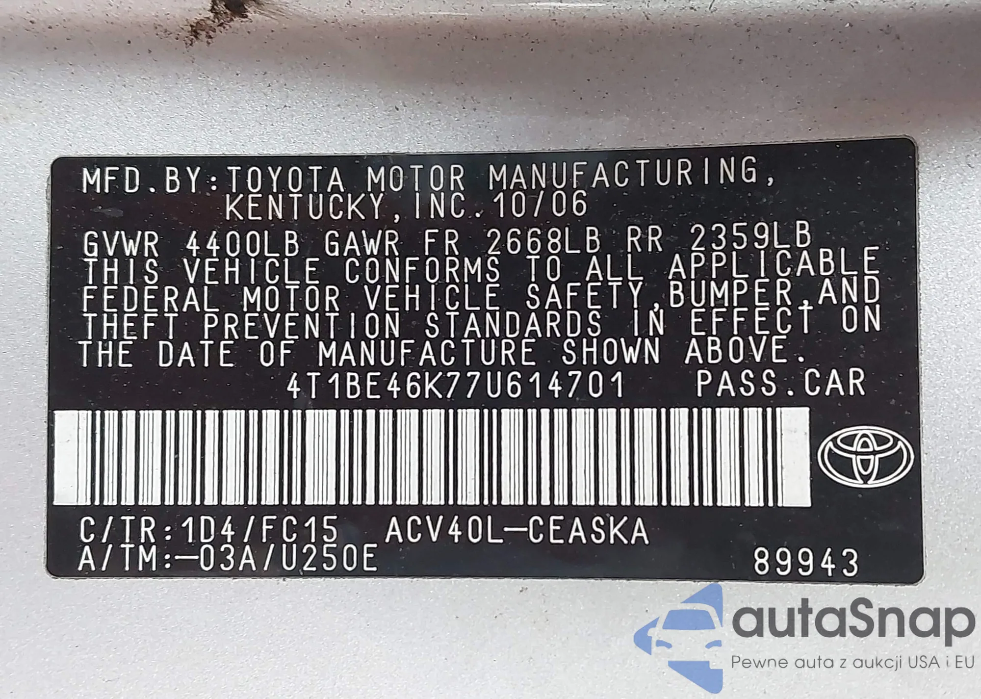 • VIN 4T4BF3EK6BR215768