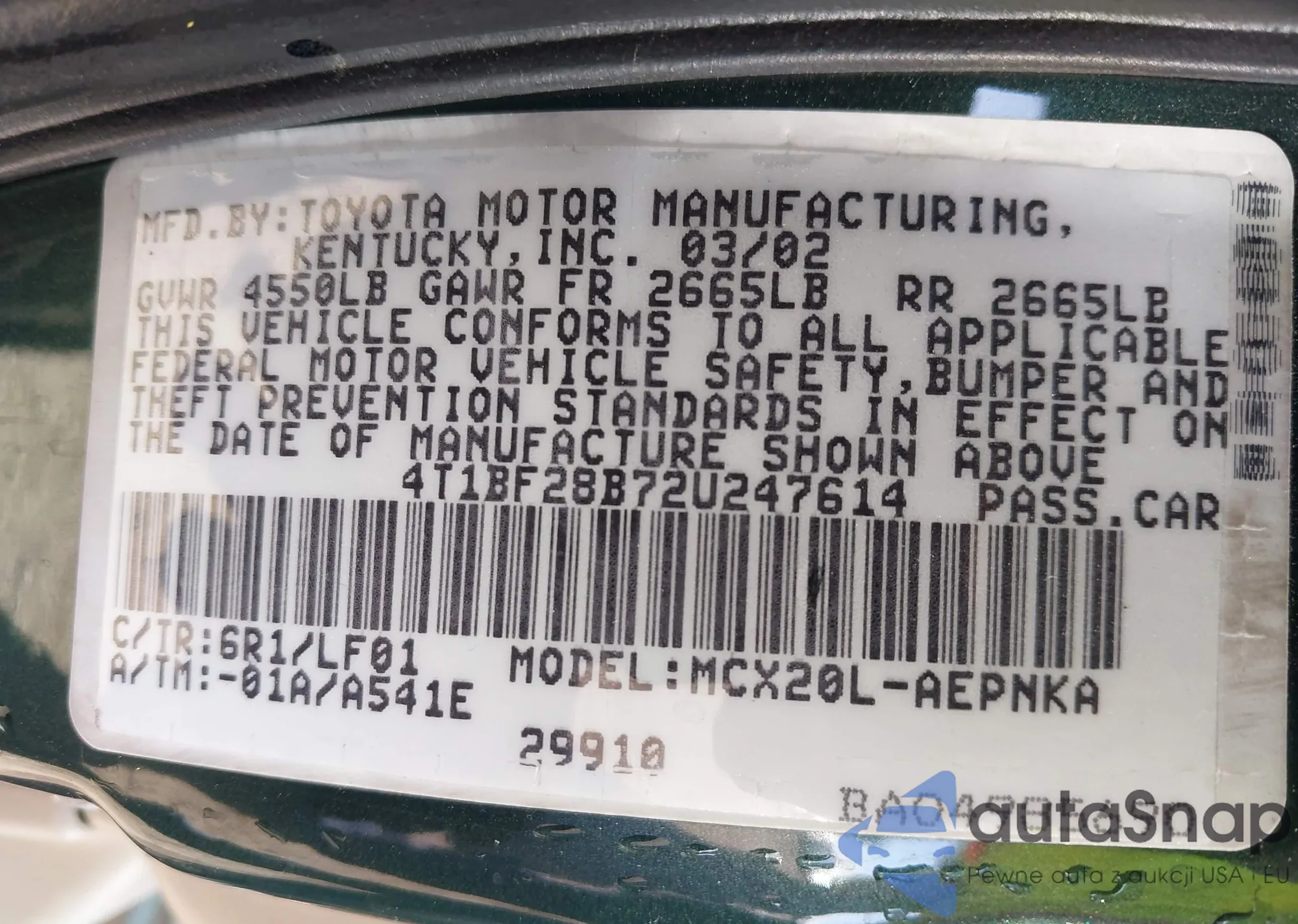 • VIN 4T1BF28B72U247614