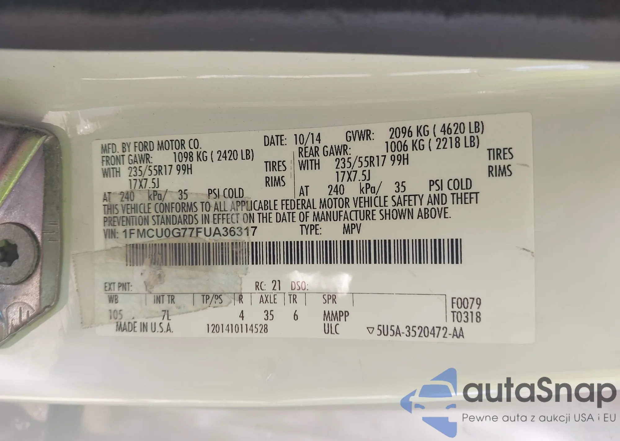 LOT: 43275862 VIN: 1FMCU0G77FUA36317