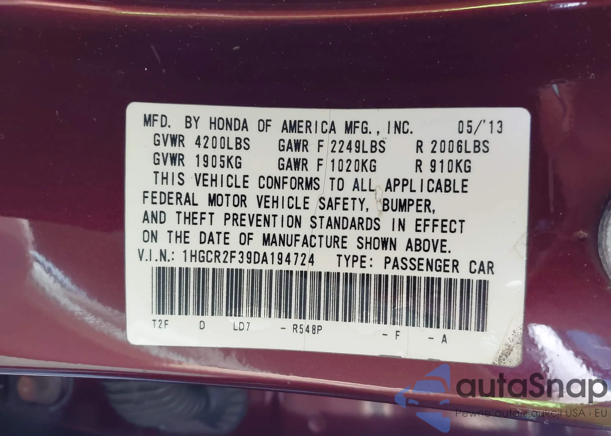 • VIN 1HGCR2F39DA194724
