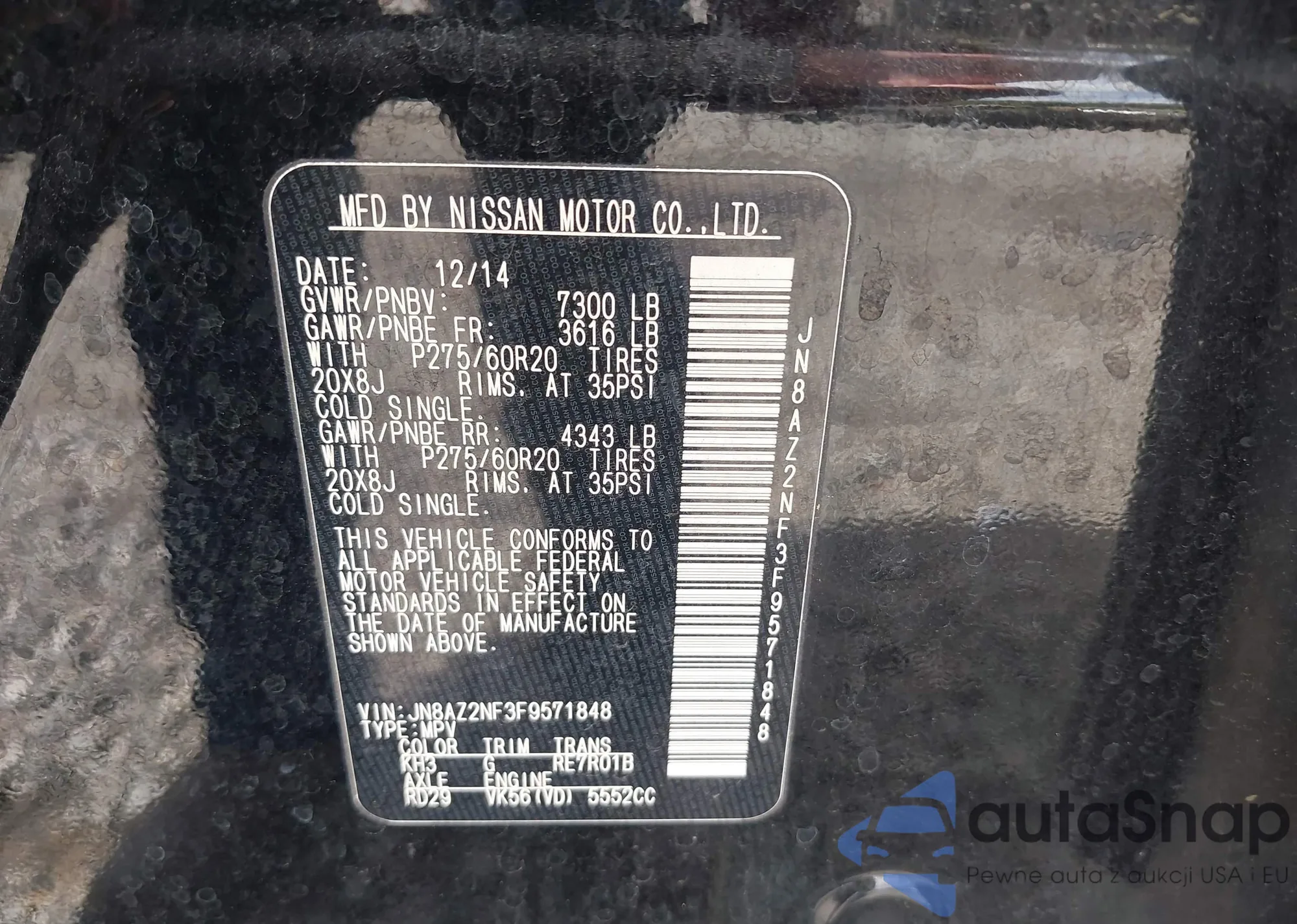 LOT: 43406146 VIN: JN8AZ2NF3F9571848