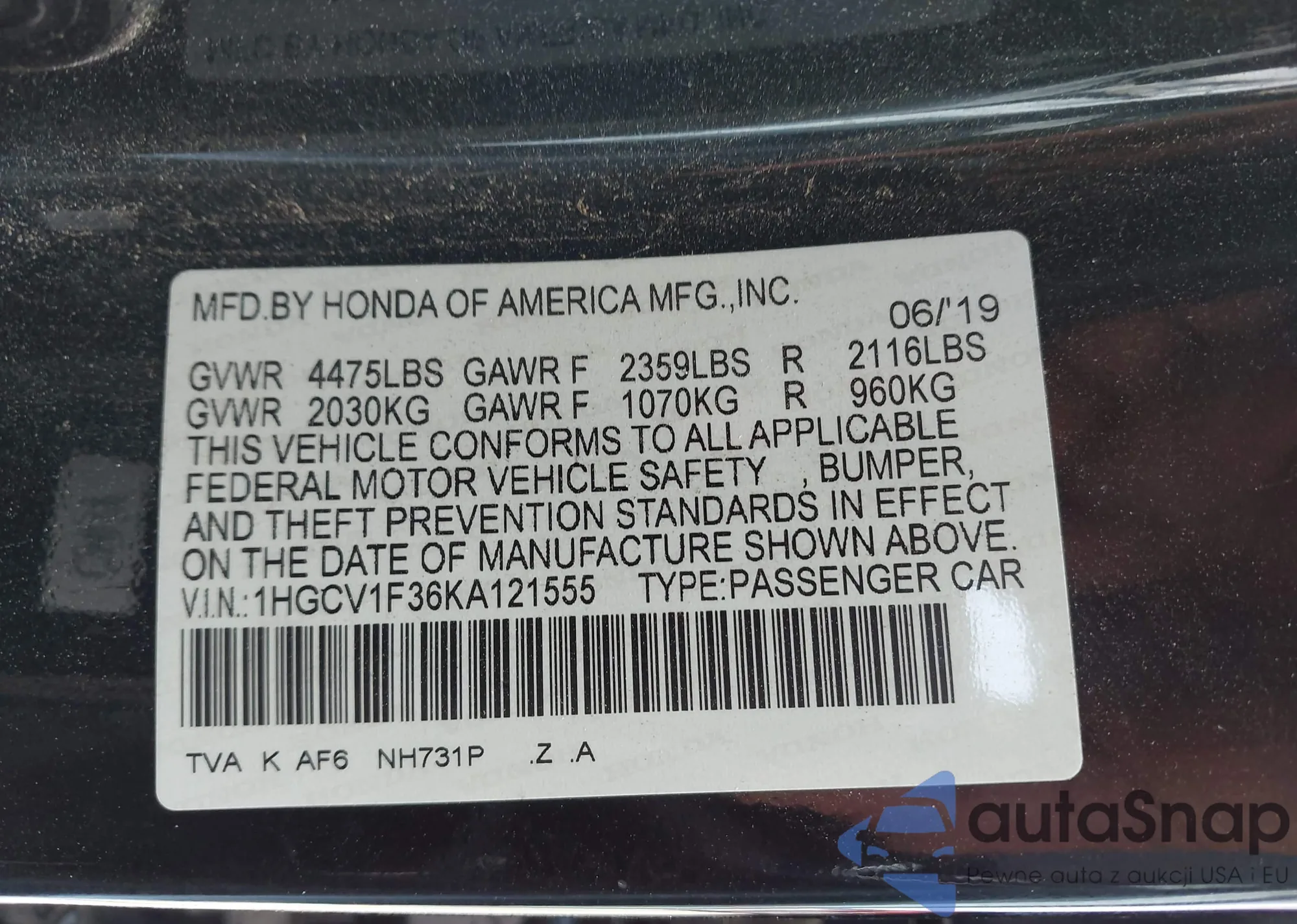 LOT: 43449253 VIN: 1HGCV1F36KA121555