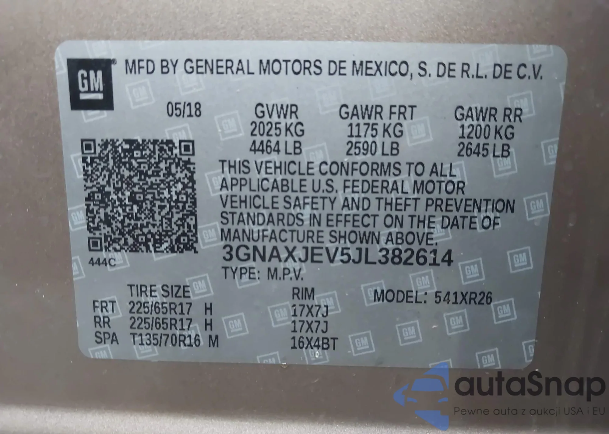 LOT: 43261723 VIN: 3GNAXJEV5JL382614