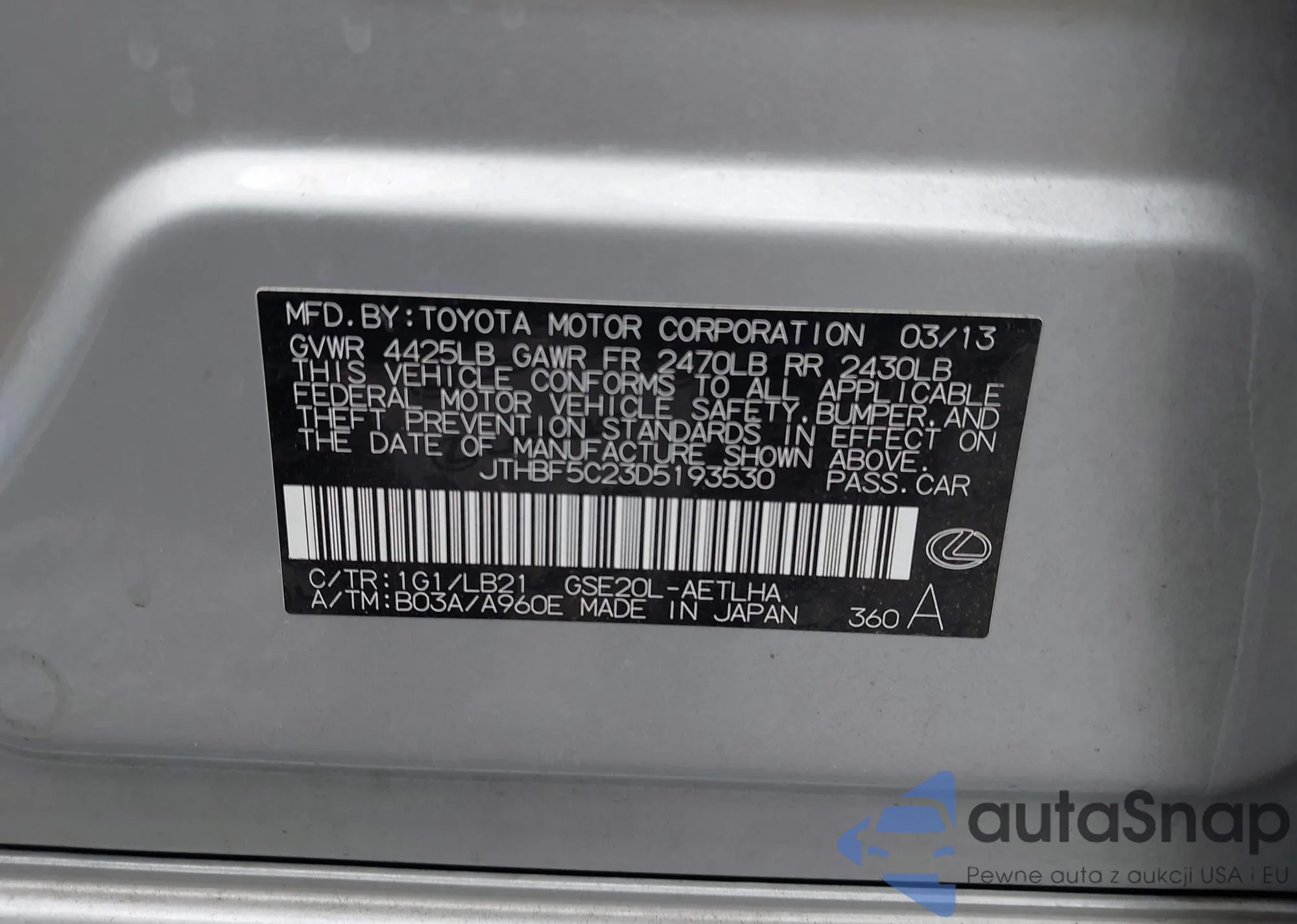LOT: 43303896 VIN: JTHBF5C23D5193530