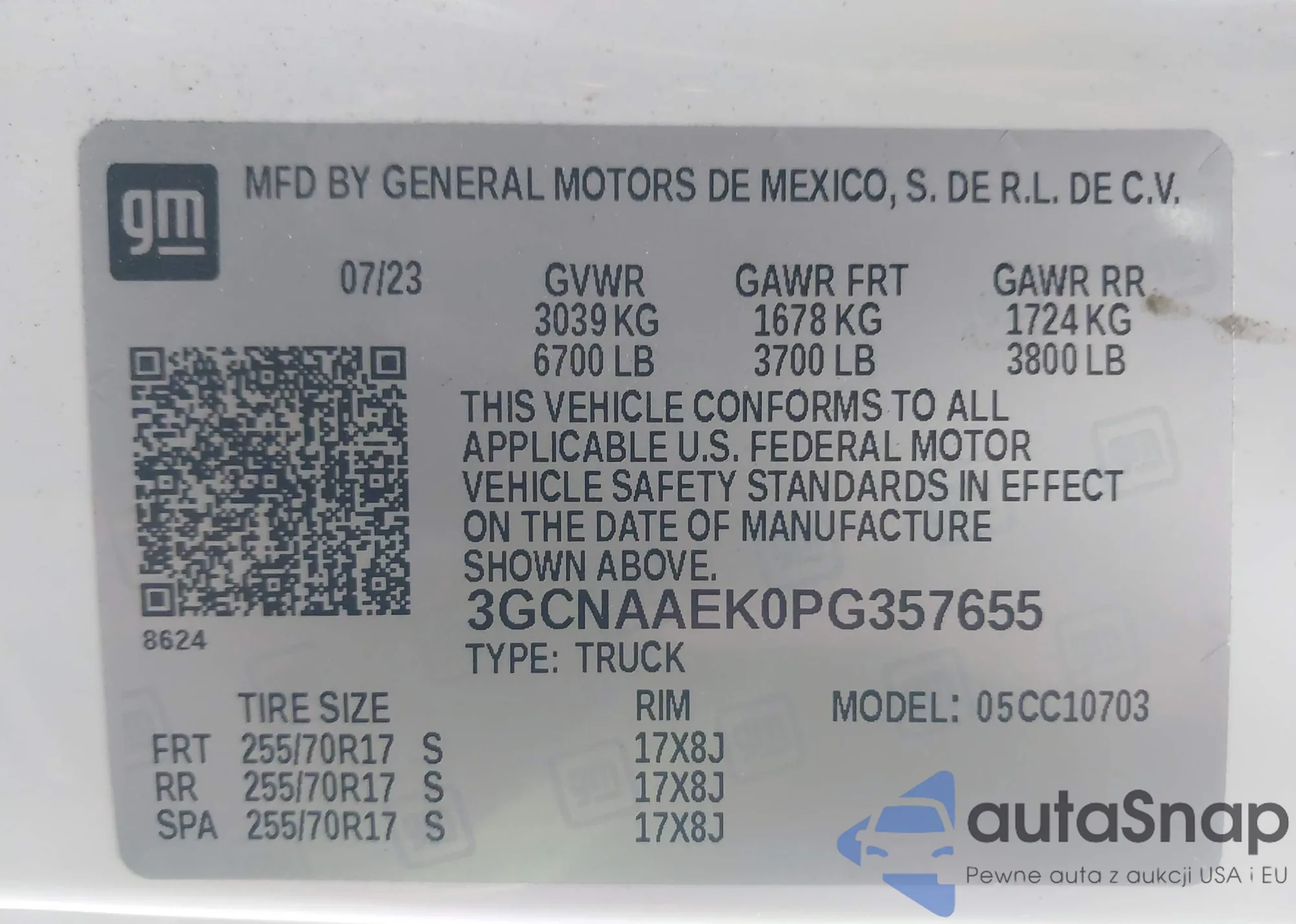 LOT: 43690813 VIN: 3GCNAAEK0PG357655