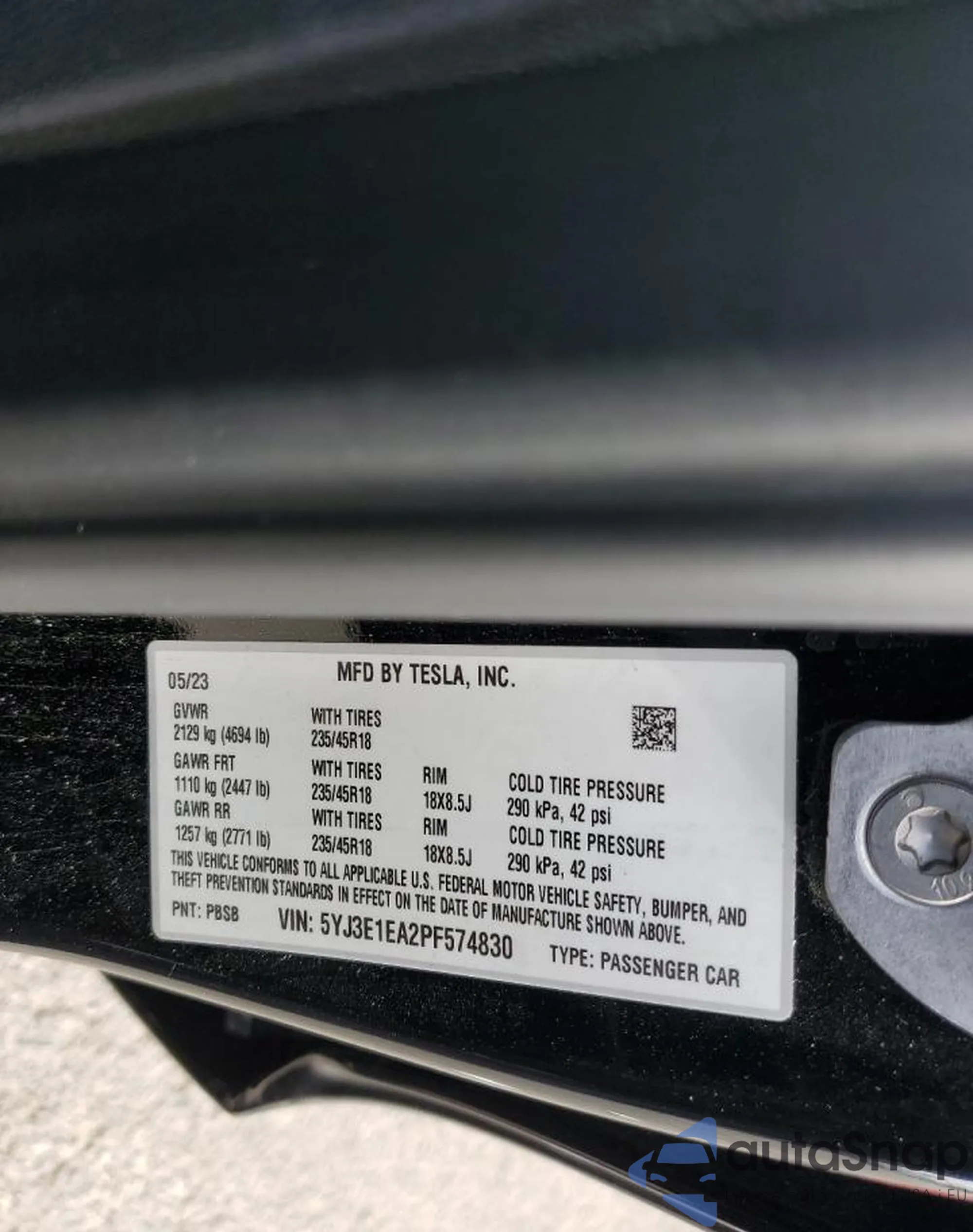 • VIN 5YJ3E1EA2PF574830