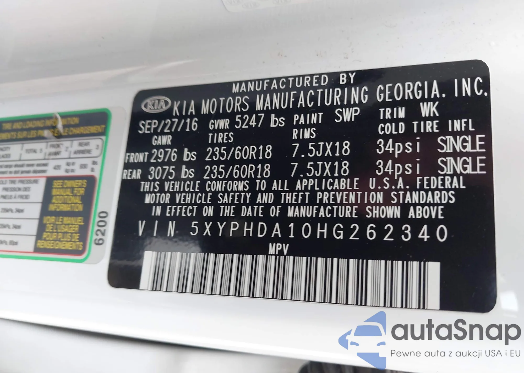 LOT: 43257809 VIN: 5XYPHDA10HG262340