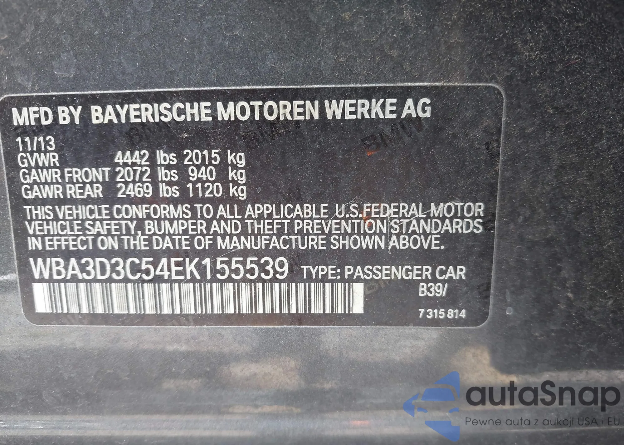 LOT: 43461318 VIN: WBA3D3C54EK155539