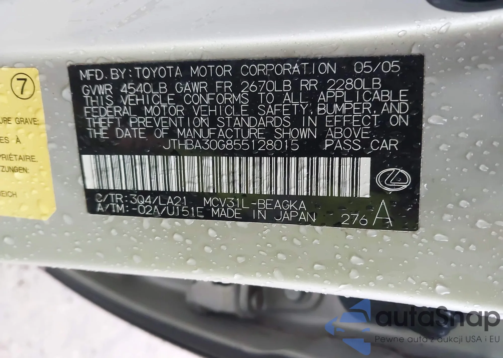 LOT: 43704676 VIN: 19UUA66278A001826