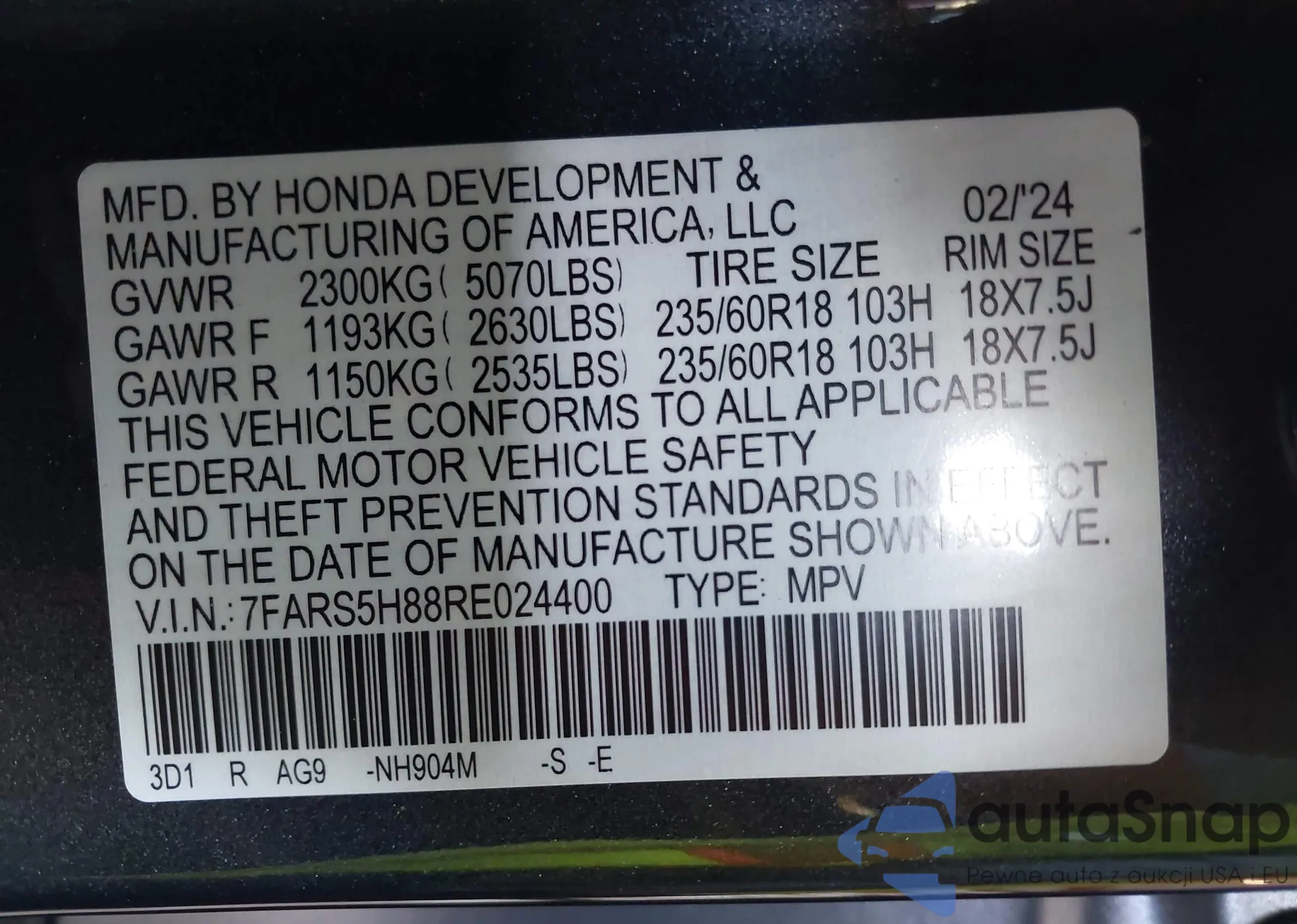 LOT: 43623949 VIN: JA4ARVAW1MU024360