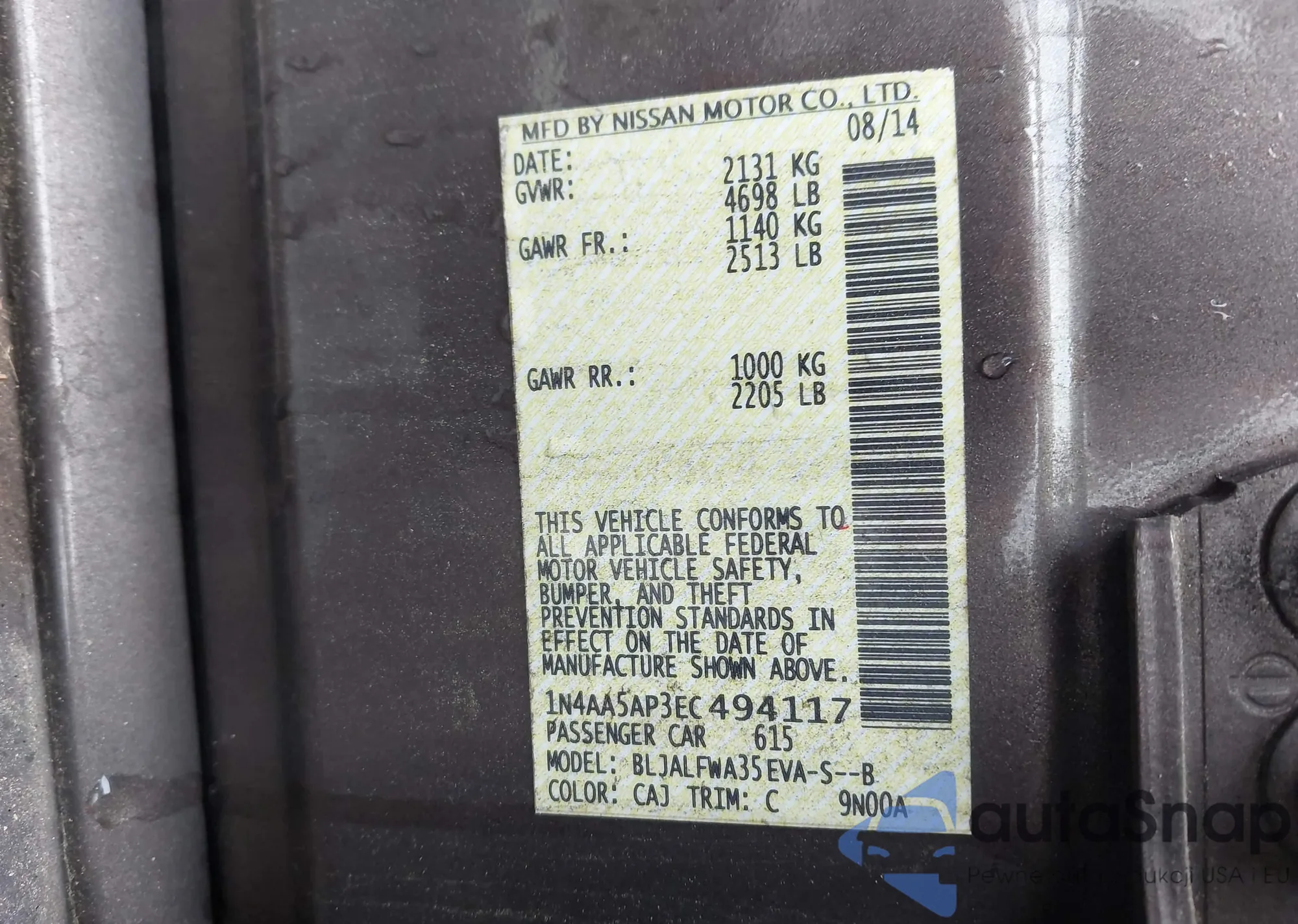 LOT: 43583462 VIN: 1N4AA5AP3EC494117