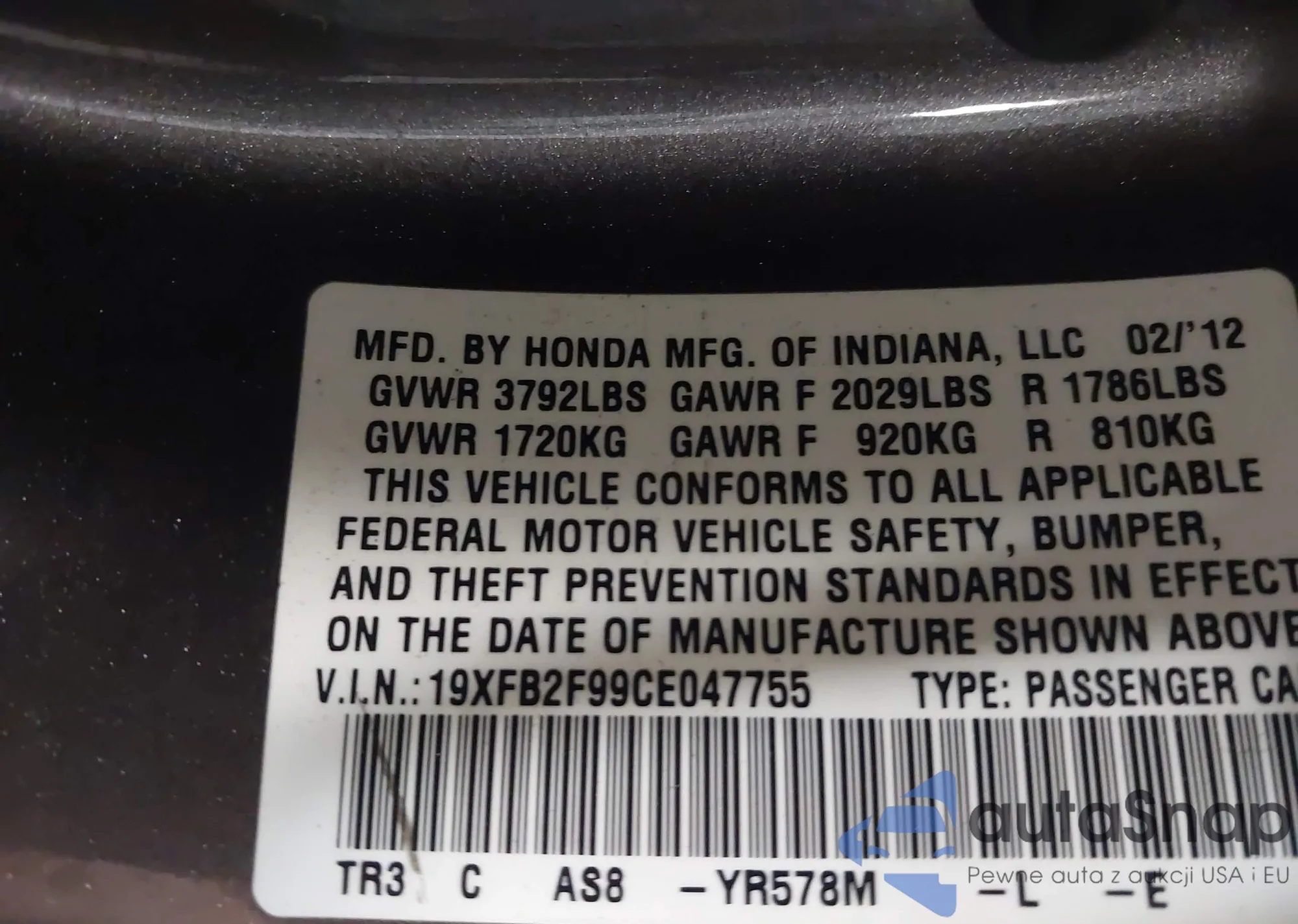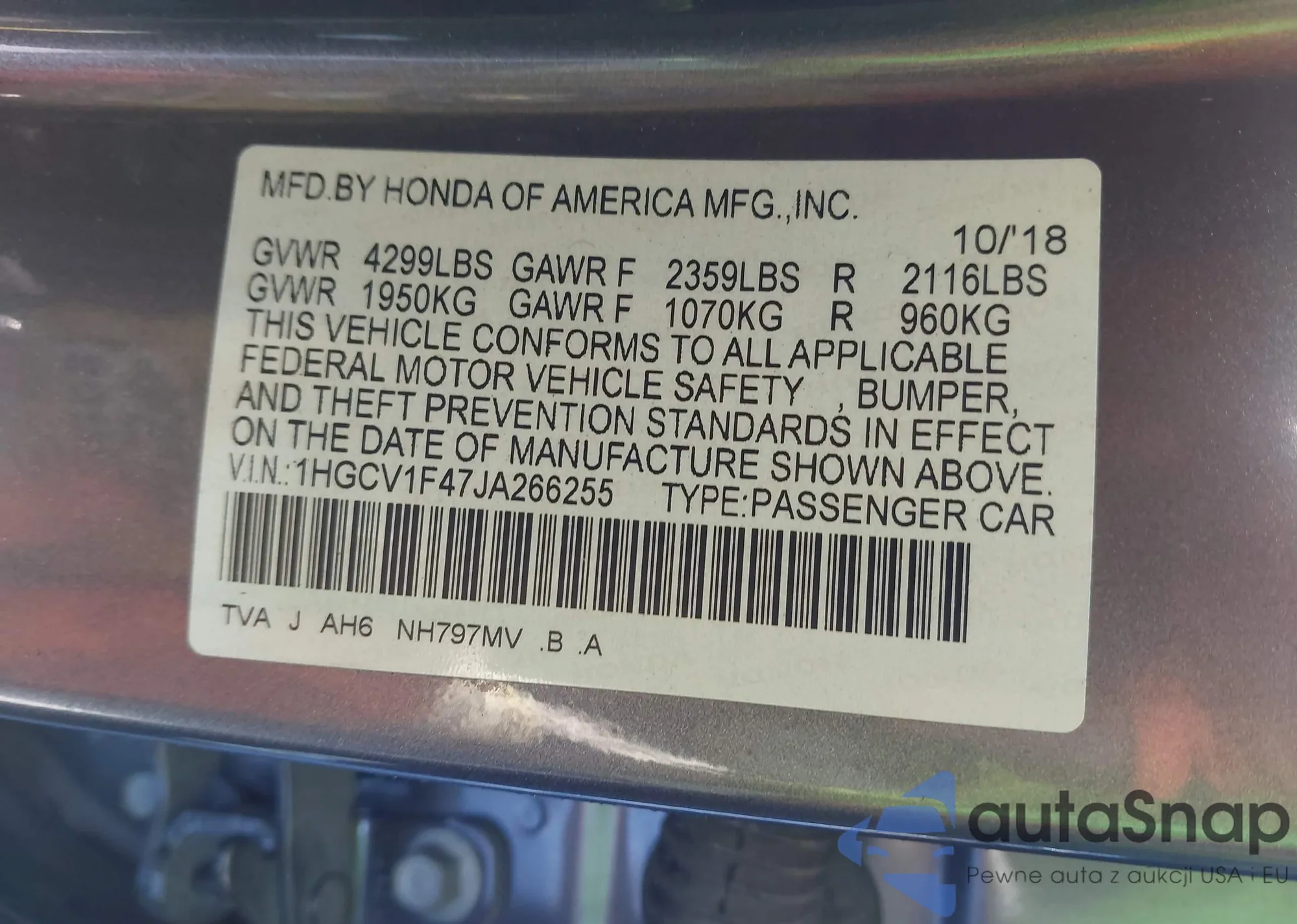LOT: 43442038 VIN: 1HGCV1F47JA266255