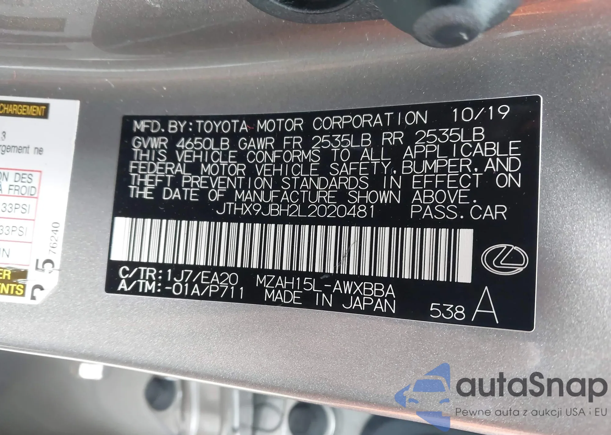 LOT: 43616351 VIN: JTHX9JBH2L2020481