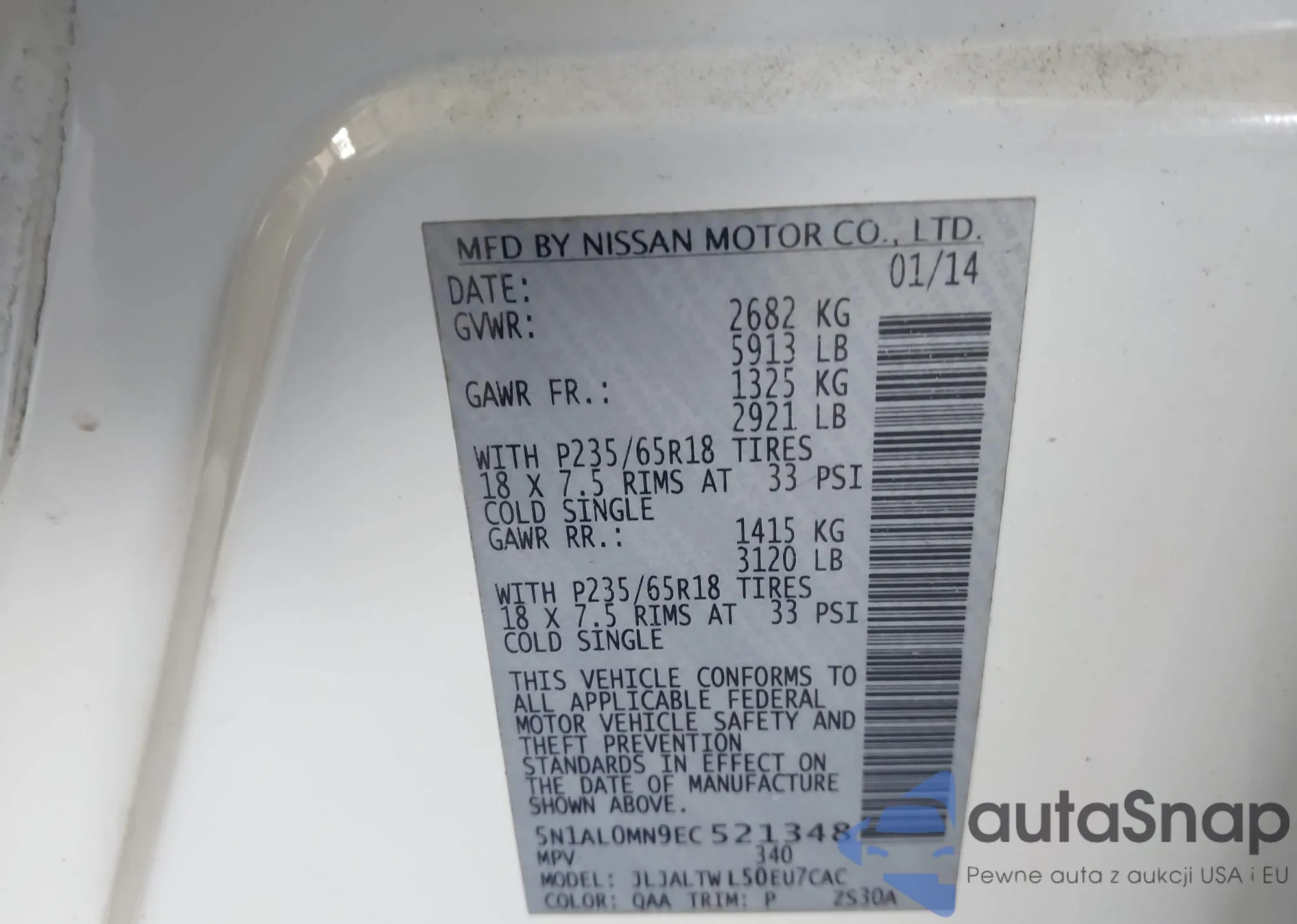 • VIN 5N1AL0MN9EC521348