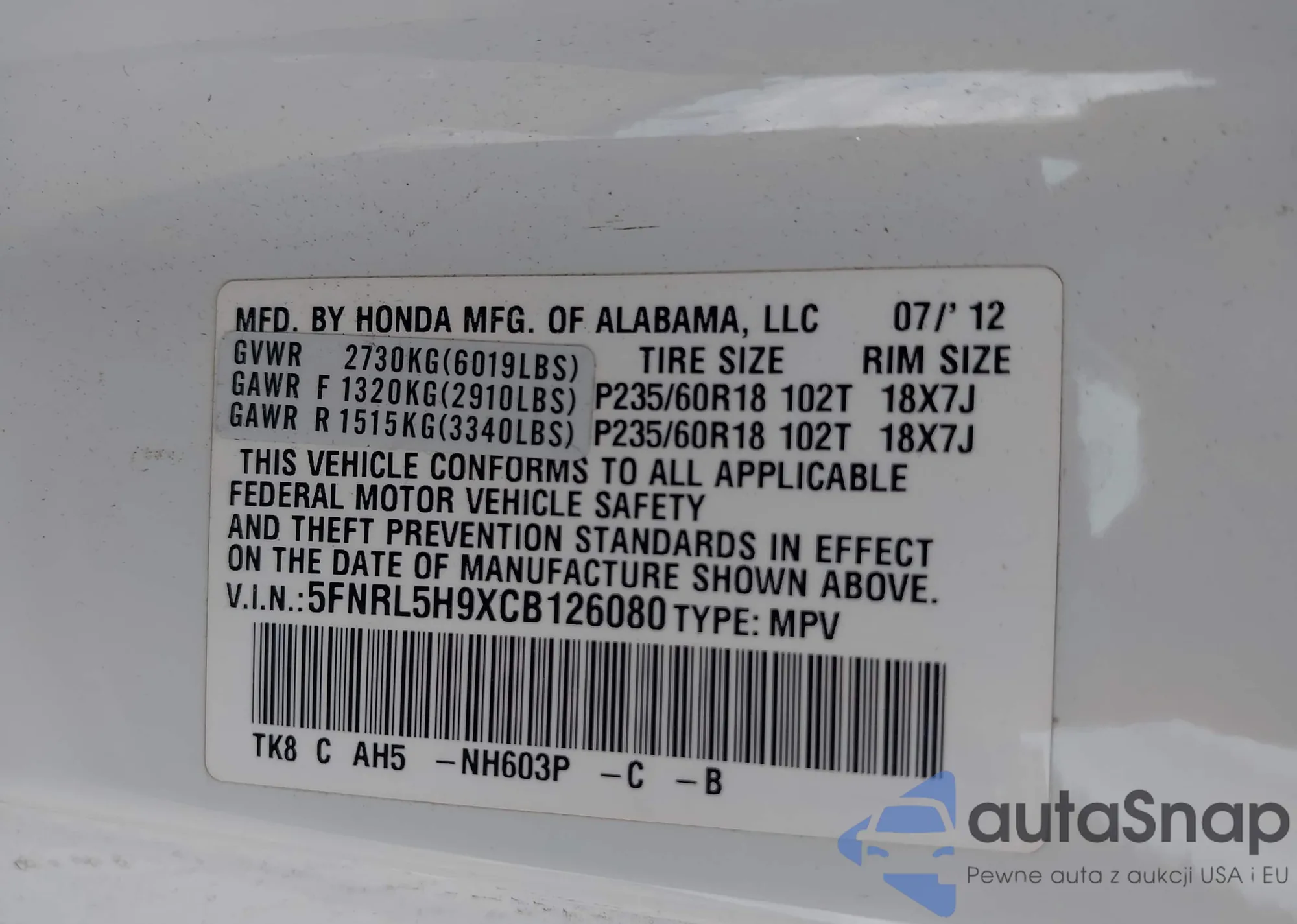 • VIN 5FNRL5H9XCB126080